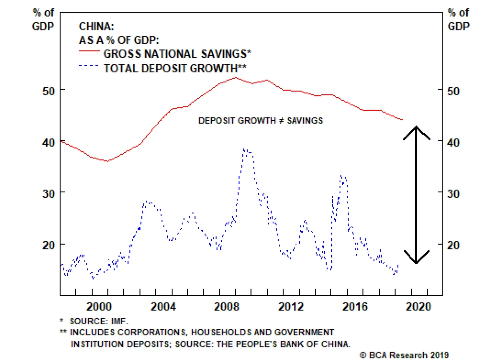 Dear Client, Credit in China has expanded at an exponential pace, with the country’s debt-to-GDP ratio climbing from 143% to more than 250% over the last decade. The speed and scale of China’s debt surge dwarfs Japan and the U.S.’ respective credit binges in the 1980’s and 2000’s, each of which ultimately led to financial market meltdowns. Why should China’s experience be any different? Given that China has pursued a different economic model whereby the banking sector is largely state-sponsored and the currency is tightly managed by the central bank, the answer to this pressing question for global markets is the subject of spirited debate at BCA and within the investment community at large. Clients are already aware that my colleagues, Peter Berezin and Arthur Budaghyan, disagree on the macro and market ramifications of China’s decade-long credit boom. The aim of this report is to provide visibility on the root sources of the view divergence, not to reconcile the gaps. We hope these insights will help shape your own conviction about this important topic. Caroline Miller Global Strategy Feature Caroline: Arthur, your cautious outlook towards emerging markets in general and China’s prospects in particular stems from your belief that China’s economy is dangerously addicted to credit as a growth driver. Please explain why you dismiss the more sanguine view that China’s elevated debt burden is a function of an equally unusually high household savings rate. Arthur: It is simple: When people use the word “savings,” they typically and intuitively refer to bank deposits or securities investments; but this is incorrect. Chart 1 (Arthur)No Empirical Evidence That Deposits = 'Savings'
