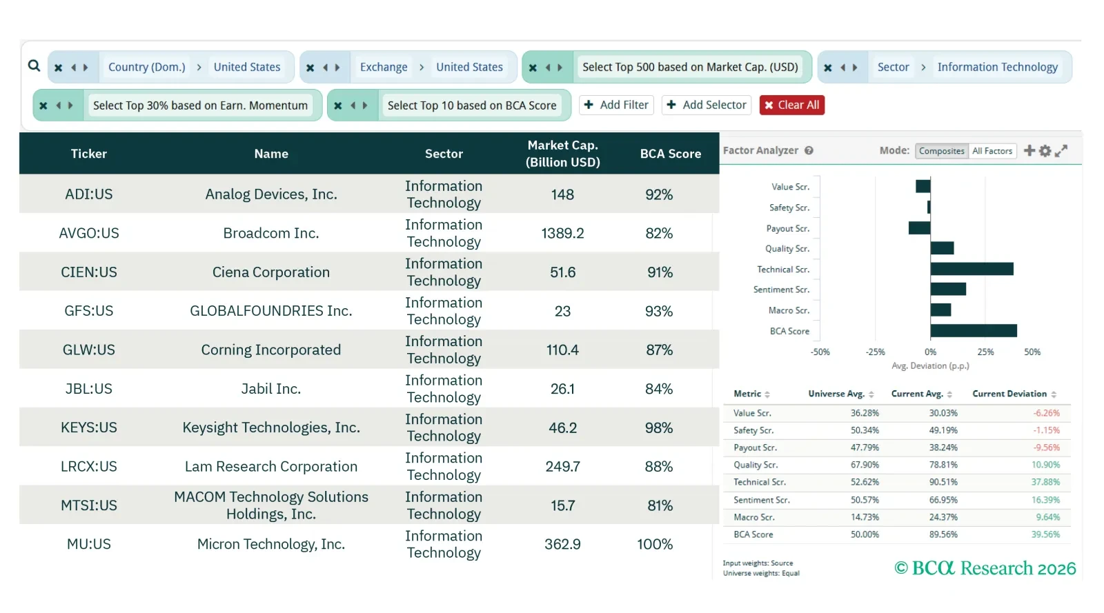 This screener report builds on the US Equity Strategy team's sector view published on 30 March 2026, where the team overweights Information Technology, Industrials, and Materials on a 3- to 12-month horizon. Here we utilize our screening tools to layer bottom-up stock selection onto their top-down sector views.