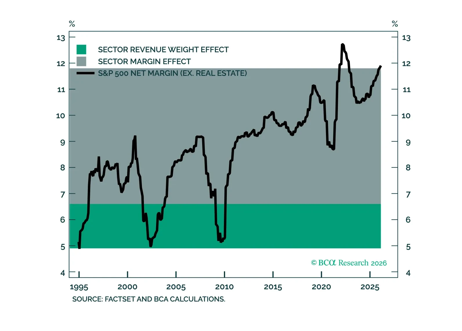 The long-run rise in S&P 500 margins reflects more than a shift toward higher-margin sectors. Most of the increase has come from higher profitability within sectors, supported by favorable mix of macro forces. Looking ahead, many of those tailwinds are likely to fade, with AI-driven productivity gains as a potential offsetting upside driver of margins.