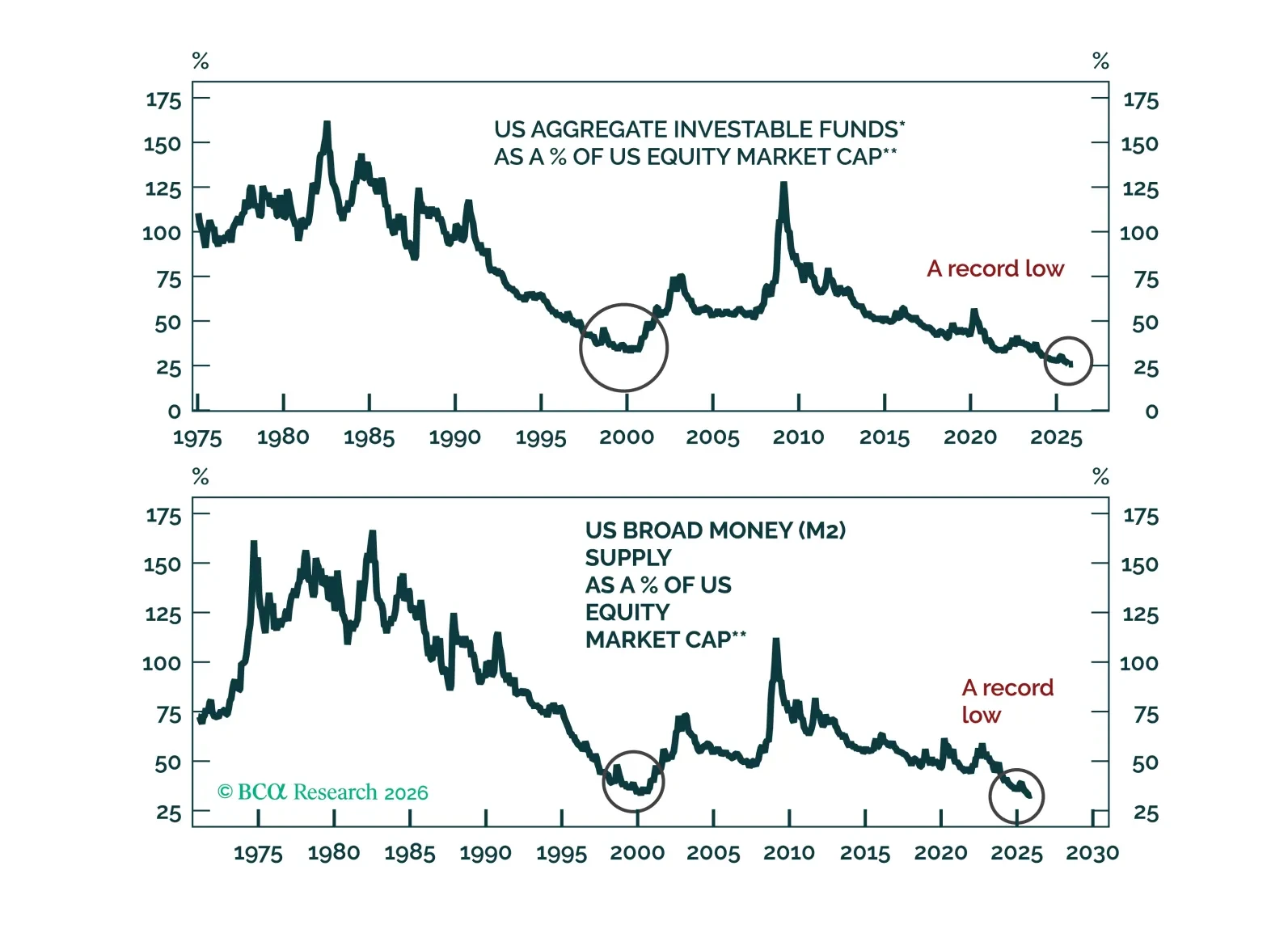 Contrary to widespread narratives, there is little cash on the sidelines. The aggregate amount of investable funds-to-equity market cap ratio is at an all-time low in the US and very low in other developed markets.