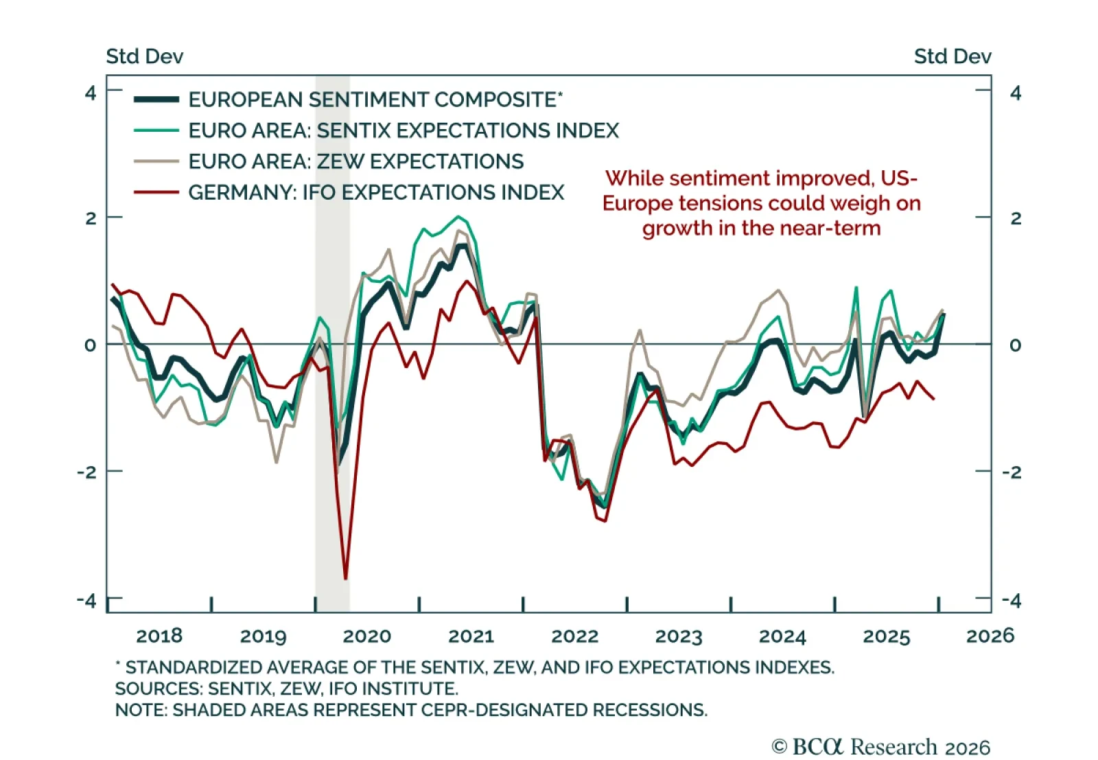 January Euro area sentiment improved, but growth momentum remains limited as tensions with the US rise and reflationary ECB cuts remain possible. January sentiment brightened in the Euro area. The ZEW survey beat expectations for…