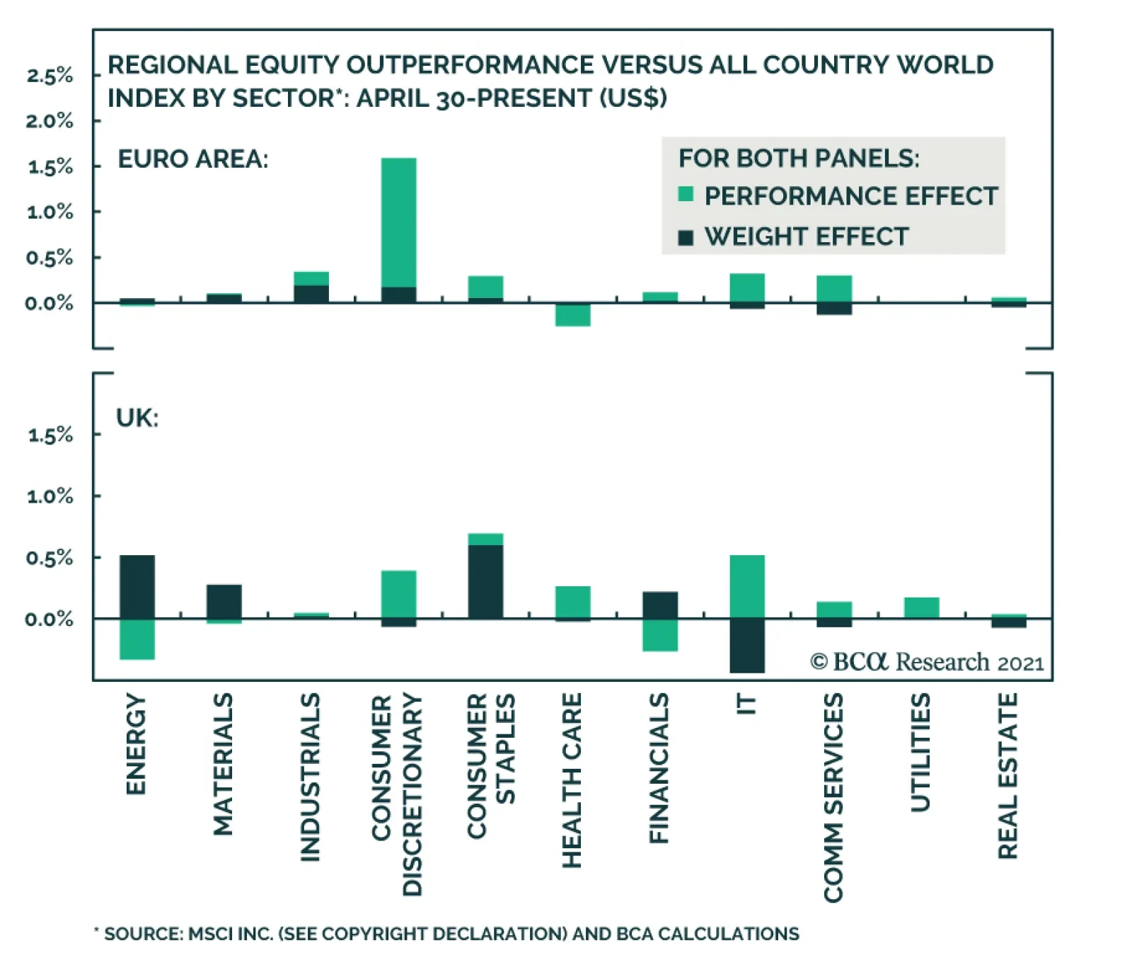 Euro area and UK stocks have recently outperformed the global equity index. Global stock prices have risen 2.2% since late April, whereas euro area stocks have risen 4.8% and UK stocks have risen 4.2%. The chart above breaks…