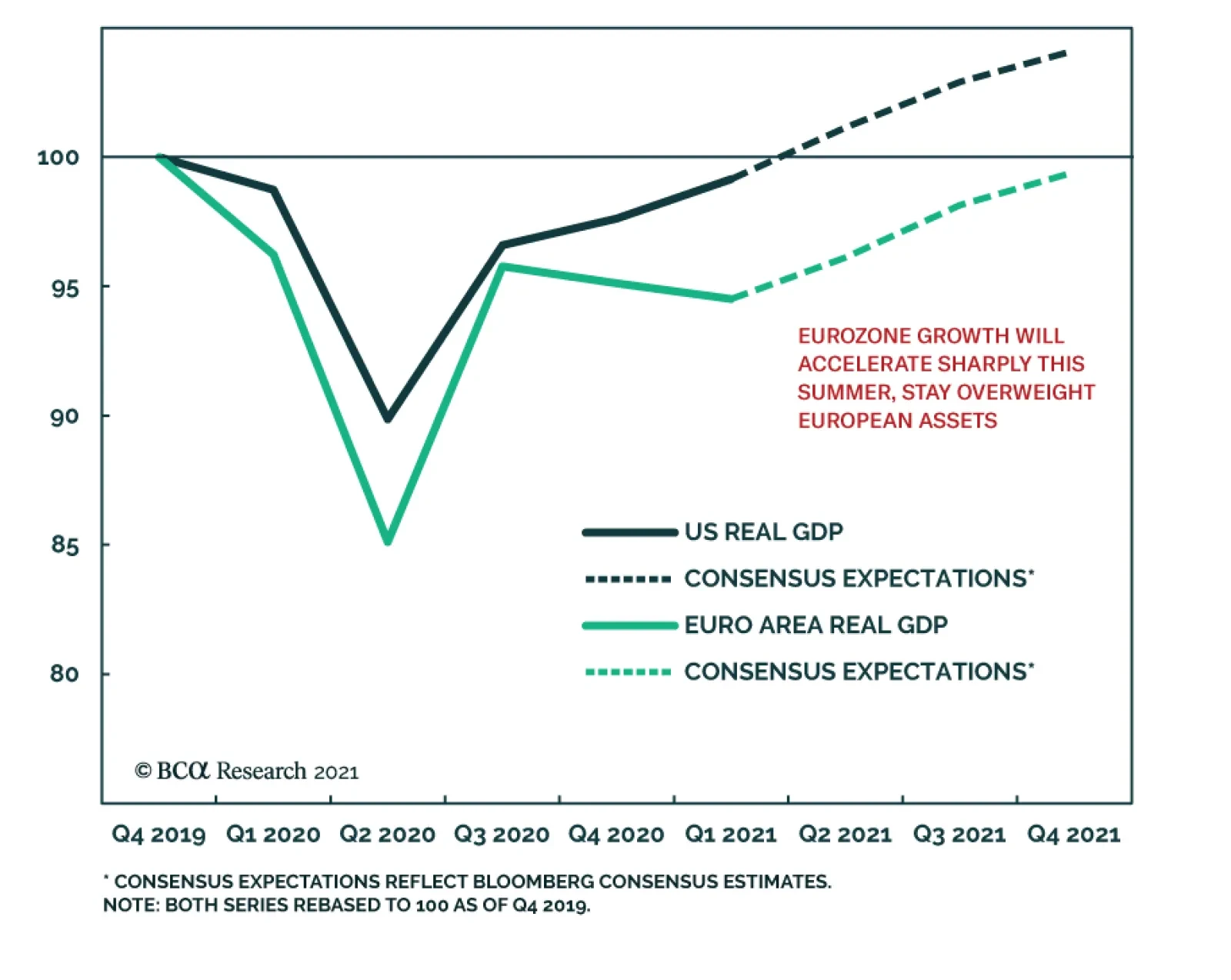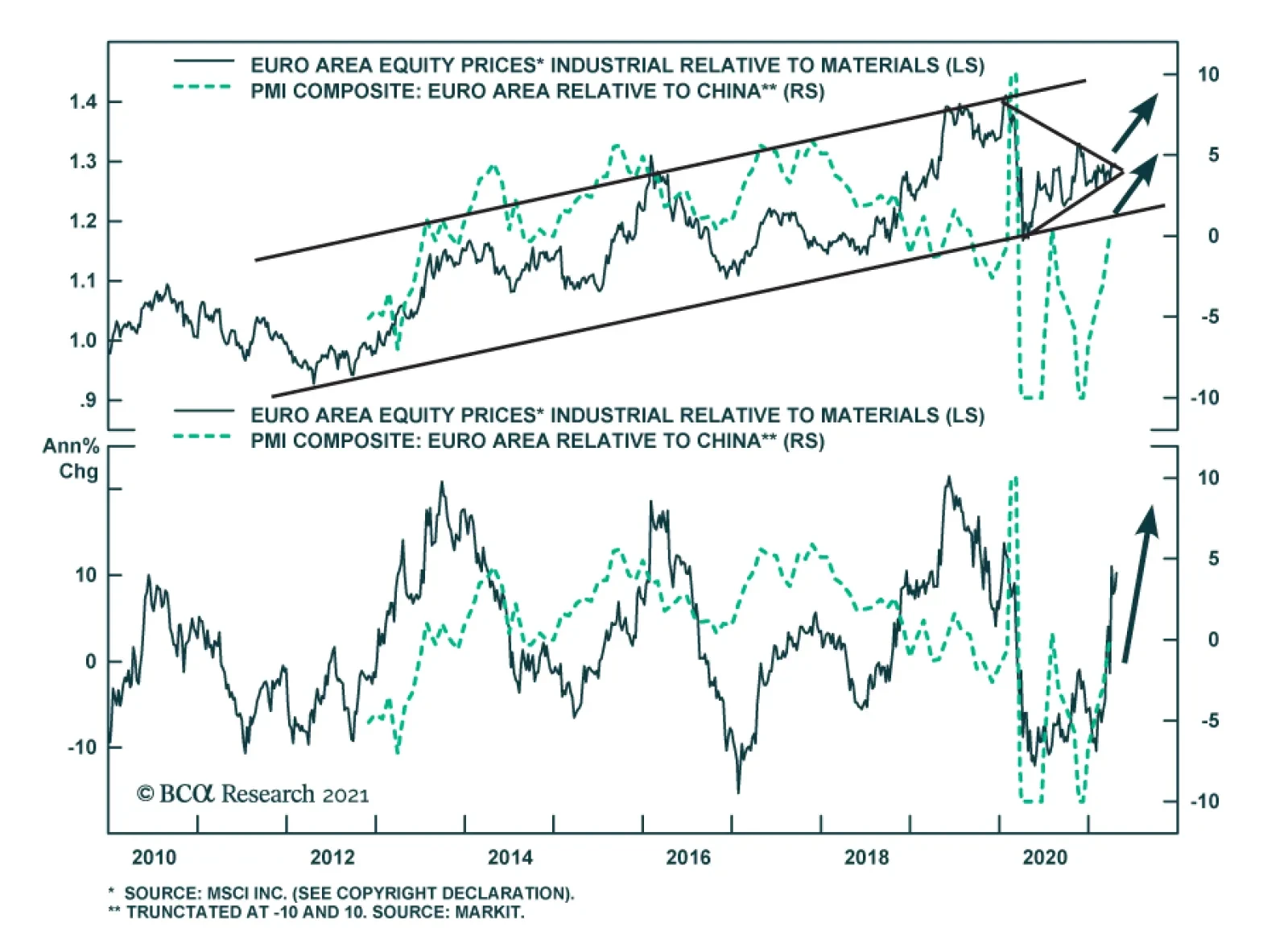 European industrial equities have further scope to outperform materials over the remainder of 2021. Despite an 11% outperformance since the second quarter of 2020, the ratio of industrials-to-materials equities still stands…