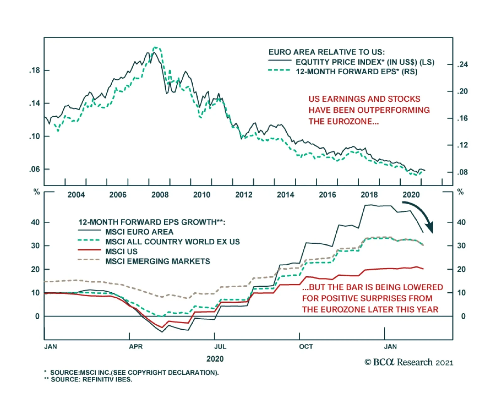 European equities lagged US ones throughout the bulk of last year, and continue to do so in 2021. Several factors explain this mediocre performance. The euro’s strength tightened monetary conditions in the euro area and…