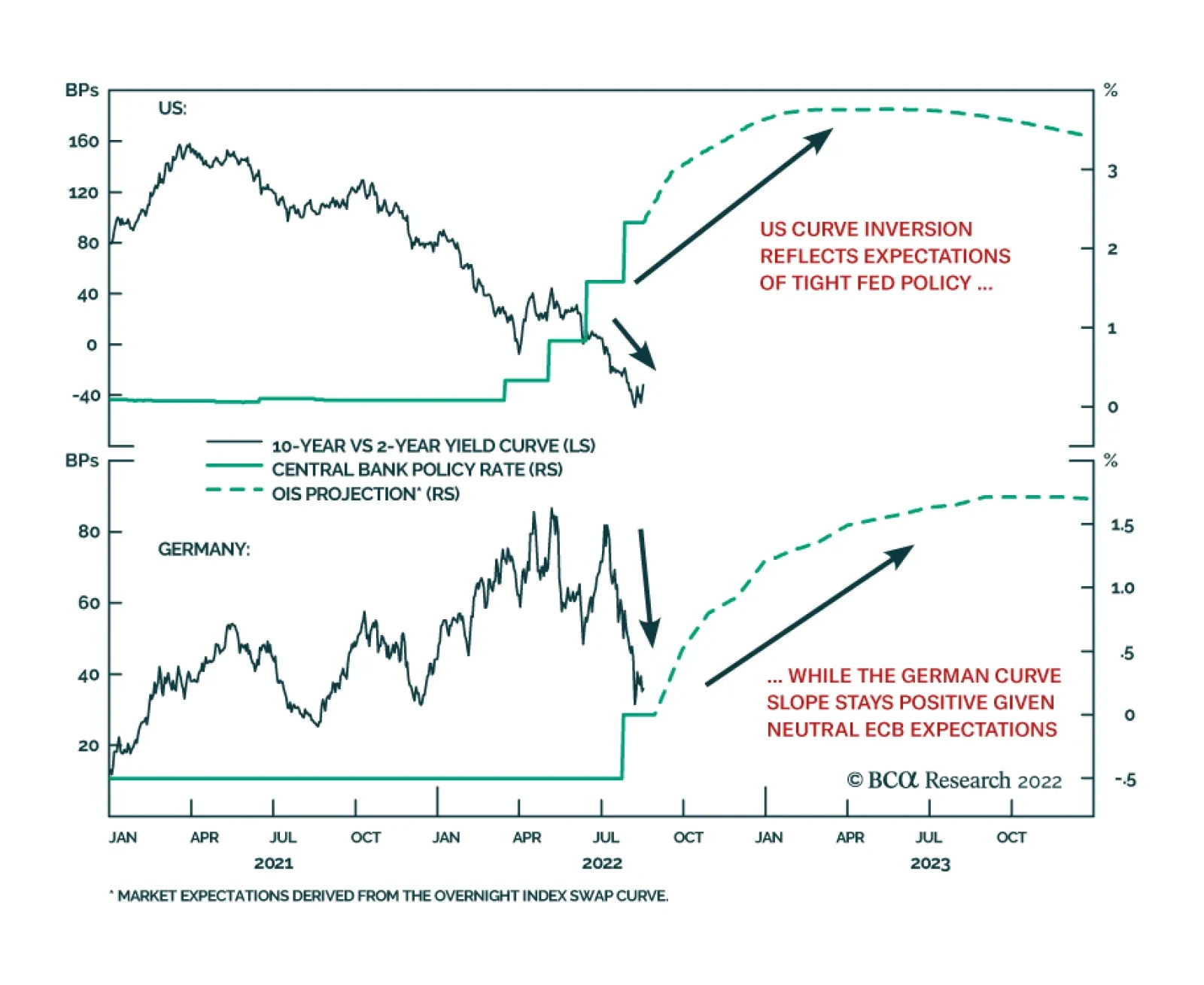 As of Thursday’s close, the 2-year/10-year US Treasury curve is inverted, with the 10-year yield trading -35bps below the 2-year yield. In Europe, there is no inversion, with the 10-year German yield trading 37bps…
