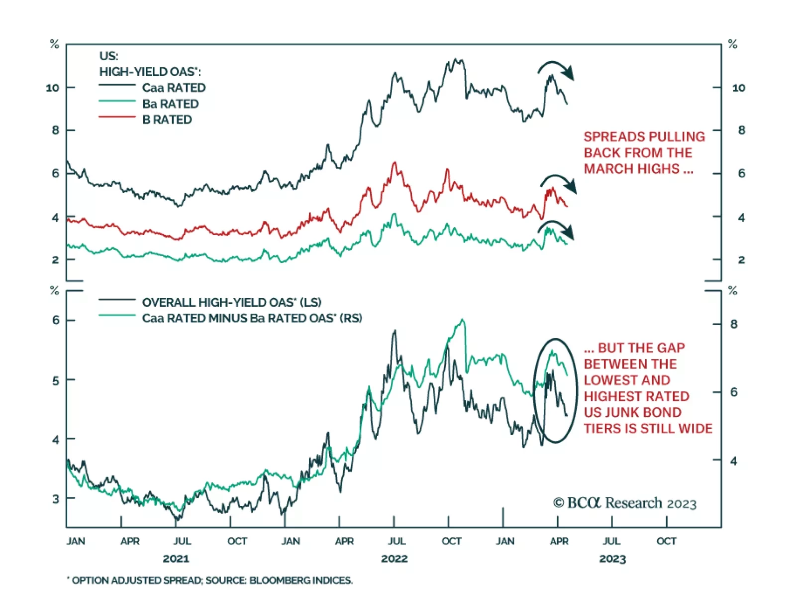 Through February and March, the number of US ‘job losers’ surged by almost half a million. Constituting the largest two-month increase in Americans who have lost their job since the depth of the pandemic. Unless we see a big drop in the number of job losers in the coming months, the correct investment strategy is still to position for a US recession that starts in 2023.