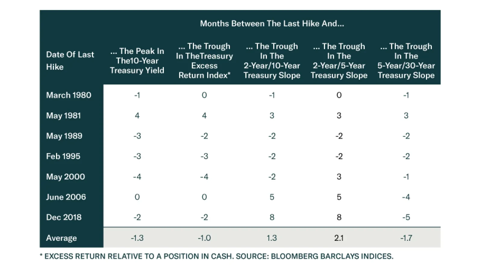 Executive Summary This report looks back at seven recent Fed tightening cycles and summarizes evidence concerning how the US Treasury curve behaves relative to the length and magnitude of the tightening cycle. We document a few consistent relationships. For example, the 10-year Treasury yield tends to peak 1-2 months before the last rate hike of the tightening cycle. We also notice that the Treasury slope is usually inverted by the time it troughs and that the 5-year/30-year slope tends to trough before the 2-year/5-year slope. Given our view that the peak fed funds rate may not occur until the second half of 2023, we expect another leg higher in bond yields before we reach the cyclical peak. We also anticipate further flattening of the 5-year/30-year Treasury curve. Timing Fed Tightening Cycles