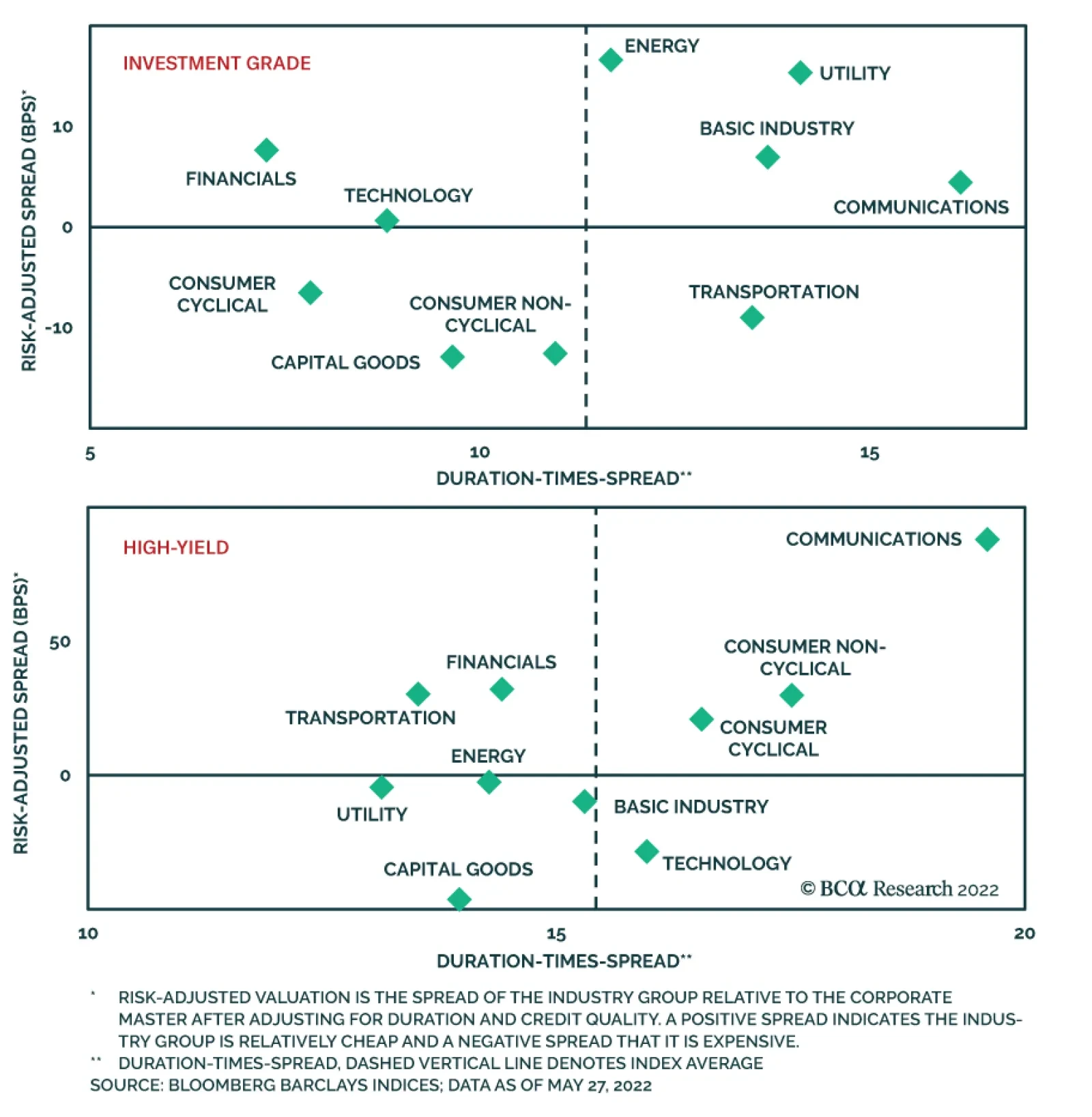 Corporate bond spreads in the US and Europe have widened since early April, with European credit taking a bigger hit because of worsening growth and inflation momentum. European corporate bond valuations look fairly cheap, both for investment grade and high-yield. This is true in absolute terms but also relative to the US, where spread valuations are more mixed. An easing of stagflation fears in Europe is a necessary condition for a valuation convergence with the US. The US investment grade credit curve is steep relative to the overall level of credit spreads, making longer-maturity corporates more attractive. Energy bonds offer the most compelling combination of valuation and fundamental support (from high oil prices) within US investment grade. Within US high-yield, Energy valuations look much less compelling after the recent outperformance. The best medium-term industry values in European credit are in investment grade Financials and high-yield Consumer Cyclicals & Non-Cyclicals. Bottom Line: Continue to favor both US high-yield and European investment grade corporates versus US investment grade. Stay neutral high-yield exposure on both sides of the Atlantic. Within Europe, stay up in quality within both investment grade and high-yield until near-term macro risks on growth & inflation subside. Feature Corporate bonds in the US and Europe have gone through a rough patch in recent weeks, underperforming government bonds in response to the “triple threat” of high inflation, tightening monetary policy and slowing growth momentum. European credit has taken the more severe hit compared to the US, with markets pricing in greater risk premia because of additional regional threats to growth (and inflation) from the Ukraine war. In this Special Report, jointly presented by BCA Research US Bond Strategy and Global Fixed Income Strategy, we assess credit spread valuations in US and European corporates after the latest selloff, across credit tiers, maturities and industry groups. Stay Cautious On US Corporate Bonds Chart 1US Credit Spreads
