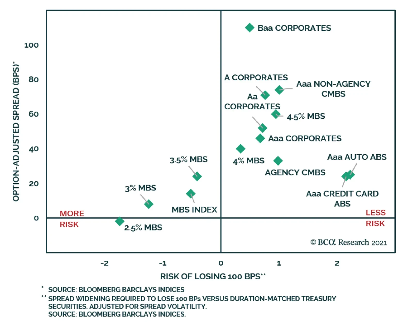 Given our view that US Treasury yields will be flat-to-higher for the next 6-12 months, we recommend an up-in-coupon bias within Agency MBS. Specifically, the 2%, 2.5% and 3% coupons have the most scope for duration extension in a rising yield environment and should be avoided. The 4% and 4.5% coupons, on the other hand, are less negatively convex and are better able to weather the storm of rising bond yields. In a flat bond yield environment, the best performing coupons are likely to be those with the widest OAS. This makes the 4% and 4.5% coupons look much more attractive than the 1.5% coupons, even though they have similar convexities. Overall, we recommend owning the 4% and 4.5% coupons within the conventional 30-year Agency MBS coupon stack and avoiding the 2%, 2.5% and 3% coupons. One final point worth making is that we also continue to recommend an underweight allocation to MBS within a US bond portfolio. That is, though higher coupon MBS look better than the low coupons, the entire sector looks unattractive compared to alternatives like consumer ABS, Agency CMBS and even investment grade corporate bonds. Chart 8 shows a version of our Excess Return Bond Map, a visual guide that is useful for quickly assessing the risk/reward trade-off between different US spread products.3 The Map shows OAS as a measure of expected return on the Y-axis, and a proprietary risk measure called the “Risk Of Losing 100 Bps” on the X-axis. A higher number on the X-axis indicates less risk of losing 100 bps and vice-versa. Chart 8Excess Return Bond Map