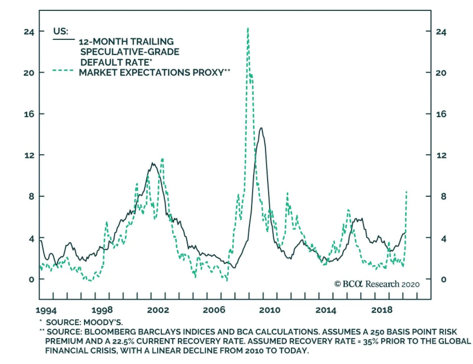This helps clarify the task at hand. We must make an assumption about what the default and recovery rates will be for the next 12 months, then apply those assumptions to the current index spread. The resulting Default-Adjusted Spread will tell us if High-Yield bonds are worth a look. Table 2 shows the Default-Adjusted Spread that results from different combinations of default and recovery rates.6 For example, a 10% default rate and 35% recovery rate together imply a Default-Adjusted Spread of 271 bps, suggesting an attractive buying opportunity. Table 2Default-Adjusted Spread (BPs) Given Different Assumptions For Default And Recovery Rates
