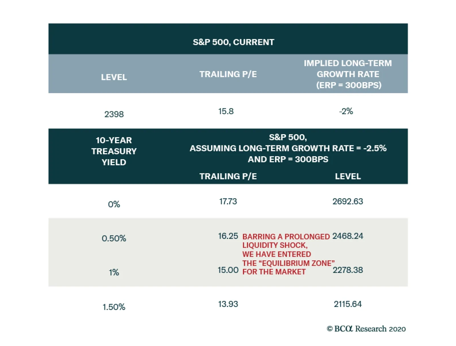 We can use a simple discounted cash flow model to extract the expected growth rate of long-term earnings embedded in the S&P 500. To do so, we assume that the ERP is 300 basis points, close to the long-term outperformance of stocks versus bonds. At current multiples and 10-year yields, investors are pricing in a long-term growth rate of -2% annually for earnings (Table I-3). In comparison, investors were more pessimistic in 1974, 2008 and 2011 when they anticipated long-term earnings contractions of -2.5% annually. If we assume that the long-term growth of expected earnings will fall to that depth, then we can estimate trailing P/E multiples will be under different risk-free rates. If yields fall to zero, then the P/E would be 17.7 or a price level of 2,692; however, if they rise to 1.5%, then the P/E would decline to 13.9 or a price level of 2,115 (Table I-3). Chart I-12Expected Earnings Growth And Interest Rates Are Co-Integrated