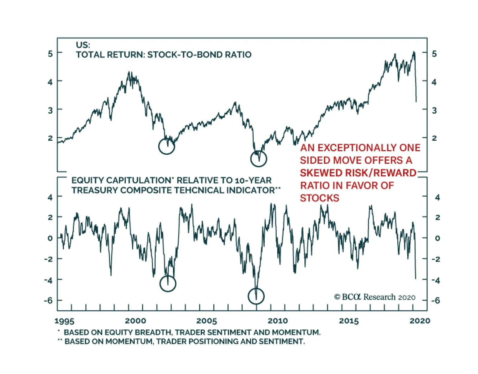 When fear and uncertainty drive every market move, technical indicators are the best tool available to gauge the immediate risk-reward ratio. Today, according to technical indicators, long-term and cyclical investors should favor stocks over bonds. The spread…