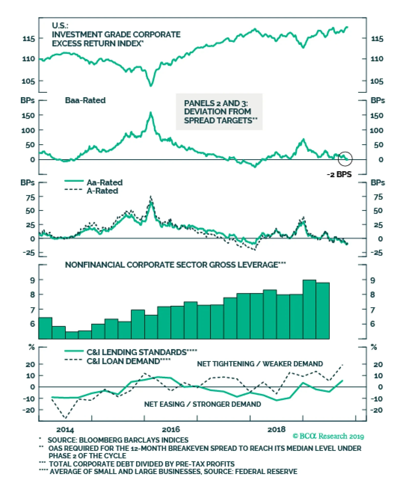 Investment grade corporate bonds outperformed the duration-equivalent Treasury index by 60 basis points in October, bringing year-to-date excess returns up to +429 bps. We consider three main factors in our credit cycle analysis: (i) corporate balance sheet health, (ii) monetary conditions and (iii) valuation.1 On balance sheets, our top-down measure of gross leverage is elevated and rising (Chart 2). In contrast, interest coverage ratios remain solid, propped up by the Fed’s accommodative stance. With inflation expectations still depressed, the Fed can maintain its “easy money” policy for some time yet. The Fed’s Senior Loan Officer survey shows that C&I lending standards tightened in Q3 (bottom panel). We expect the Fed’s accommodative stance to push standards back into “net easing” territory in Q4. But if standards continue to tighten, it could indicate that monetary conditions are not as accommodative as we think. For now, we see valuation as the main headwind for investment grade credit spreads. Spreads for all credit tiers are now below our targets, with the Baa tier looking less expensive than the others (panels 2 & 3).2 As a result, we advise only a neutral allocation to investment grade corporate bonds, with a preference for the Baa credit tier. We also recommend increasing exposure to Agency MBS in place of corporate bonds rated A or higher. Table 3ACorporate Sector Relative Valuation And Recommended Allocation*