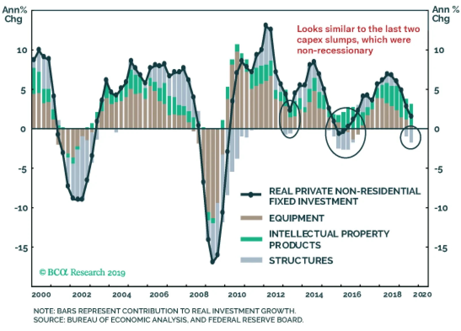 For growth pessimists in the US, a modest boost to “soft” data like the ISM does not allay their concerns about a broadening US economic slowdown. The trade war with China and the global manufacturing recession have had a clear negative impact on business confidence when looking at measures like the Conference Board CEO survey. At the same time, US capital spending has contracted in real terms during the 2nd and 3rd quarter of 2019. A logical inference would be to say that uncertainty over the trade war has led to a reduction in capex. Another possible explanation for the reduction in U.S. capital spending is slowing growth in corporate profits, which is related to a number of factors beyond the impact of tariffs and the trade war. Like the fading impact of the 2018 U.S. corporate tax cuts (that helped trigger a surge in after-tax earnings growth) and the squeeze on profit margins from higher labor costs. On a year-over-year basis, US profit growth has slowed from nearly 25% in 2018 to 1.8% in the 3rd quarter (a projection based on the 76% of S&P 500 companies that have already reported). The real non-residential investment spending category from the US GDP accounts has slowed alongside profits, from 6.8% to 1.3% on a year-over-year basis (Chart 4). At the same time, annual growth in US non-farm payrolls has slowed only modestly from 1.91% to 1.4%, with average hourly earnings growth falling from a 2019 peak of 3.4% to 3.0% in October. Given the tightness of the US labor market, with firms continuing to report difficulties in finding quality labor, it should come as no surprise that employment and wages have not slowed as much as capital spending, despite the sharp downturn in profit growth. Businesses that see their earnings getting squeezed will seek to protect profits by cutting back on investment and hiring activity. With a tight labor market, however, cutting capital spending is an easier and less costly decision than laying off workers, as it may be even harder to re-hire those employees if the economy starts to improve once again. With the US Treasury curve no longer inverted, after -75bps of Fed rate cuts and with longer-dated Treasury yields starting to increase, the US economy is stepping back from the recessionary abyss that worried investors during the summer. That can also be seen when breaking down the US non-residential investment data into its broad sub-components (Chart 5). On a contribution-to-growth basis, the only part of US investment spending that is outright contracting year-over-year is Structures. There is still modest positive annual growth in Equipment investment, although that did contract on a quarter-on-quarter basis in Q3/2019. The Intellectual Property Products category (which includes Software, in addition to Research & Development) continues to expand at a steady pace. Chart 5Slowing US Capex Focused On Structures