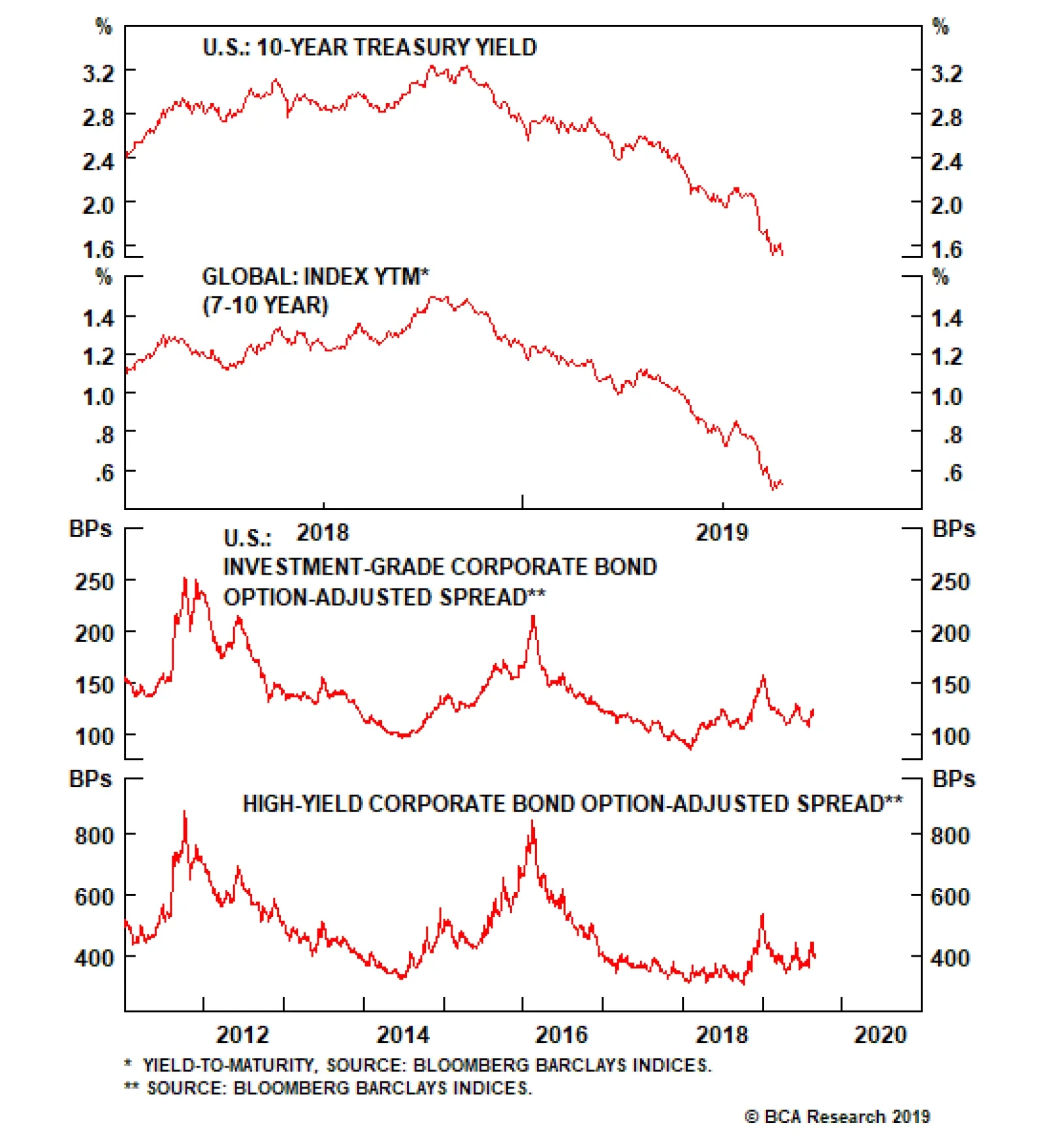Highlights Sovereign bond yields have cratered over the last few months, … : Over the last three months, 10-year yields in the U.S., France, Germany, Switzerland and Australia have fallen by 71, 64, 53, 54, and 67 basis points, respectively. … and the Treasury curve has experienced a significant bull flattening, … : Month-to-date total returns for the Barclays Bloomberg Long, Intermediate and 1-3-Year Treasury Indexes are 9.2%, 1.6% and 1.1%, respectively. … indicating that the bond market thinks more rate cuts are in store: The textbook interpretation of an inverted curve is that monetary policy is too tight and needs to be loosened, but technical factors have amplified the flattening pressure. Is the bond market reacting to weakening growth prospects, or uber-dovish central banks?: The answer has implications well beyond the fixed-income universe. It could mean the difference between an economic slowdown and a market melt-up. Feature BCA researchers convened last week for our monthly View Meeting, much of which was given over to the global decline in sovereign bond yields. Does their plunge owe more to weakening growth prospects or central banks’ synchronized dovish pivot? There have surely been elements of both; after all, central banks wouldn’t be so dovish if they weren’t concerned about the growth outlook. It is clear to our fixed-income strategists that the yield move has overshot the data, however, and they mainly attribute the overshoot to monetary policy. No central bank wants a stronger currency while confronting a demand deficiency aggravated by trade tensions and a global manufacturing slowdown. The New York Times Business section put the prevailing policy winds into living color in a nearly full-page, four-column graphic spotlighting the 32 central banks that have cut their policy rate so far this year.1 The pell-mell rush to cut rates is emblematic of a global scramble for competitiveness. No central bank wants its economy to be caught without a buffer while other economies are busily reinforcing theirs. The Message From The Bond Market Trade tensions are a legitimate threat to global economic growth already challenged by a downswing in the global manufacturing cycle. A recession is a possibility, but it is hardly a foregone conclusion. We agree with our fixed-income colleagues that the yield selloff has overrun the economic fundamentals. Last week’s preliminary European manufacturing PMIs suggested that manufacturing may finally be stabilizing, and there is still no evidence that the manufacturing downturn has infected the services sector (Chart 1). A recession is hardly a foregone conclusion. 10-year Treasury yields have been falling sharply since their 3.25% peak in early November, and the current leg down is the third in a series of sharp declines (Chart 2, top panel). Global sovereign yields have followed the same pattern (Chart 2, bottom panel), but the latest plunge is as much a reflection of ubiquitous easing biases as it is of new concerns about economic weakness. That may sound like a minor point, of interest only to macro specialists, but it has import for all investors. If the yield decline isn’t signaling new softness, then easier financial conditions will be free to act as a tailwind for risk assets. Chart 1Services Are Holding Up ...