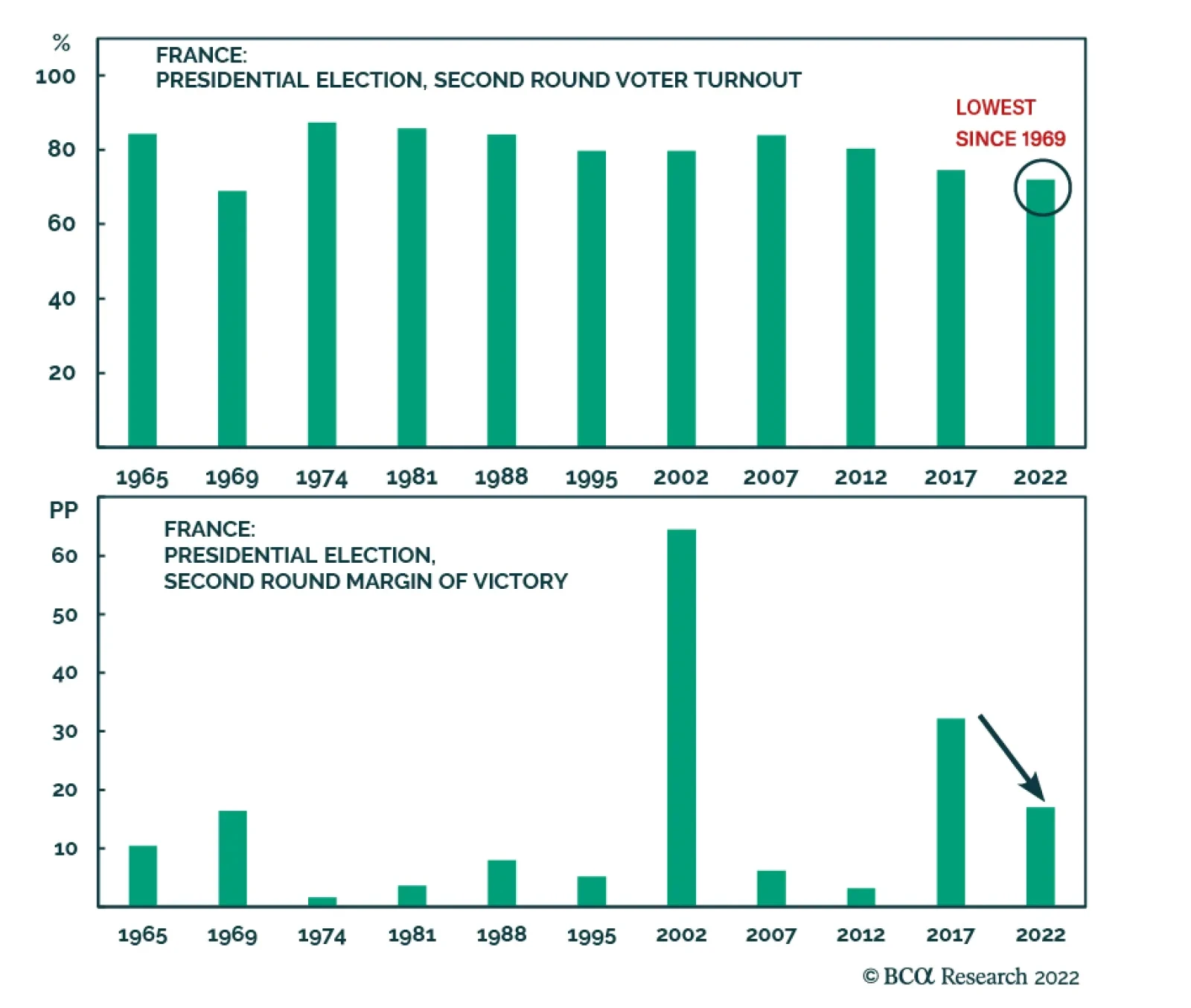 Executive Summary Macron Still Favored, But Le Pen Cannot Be Ruled Out Macron is still favored to win the French election but Le Pen’s odds are 45%. Le Pen would halt France’s neoliberal structural reforms,…