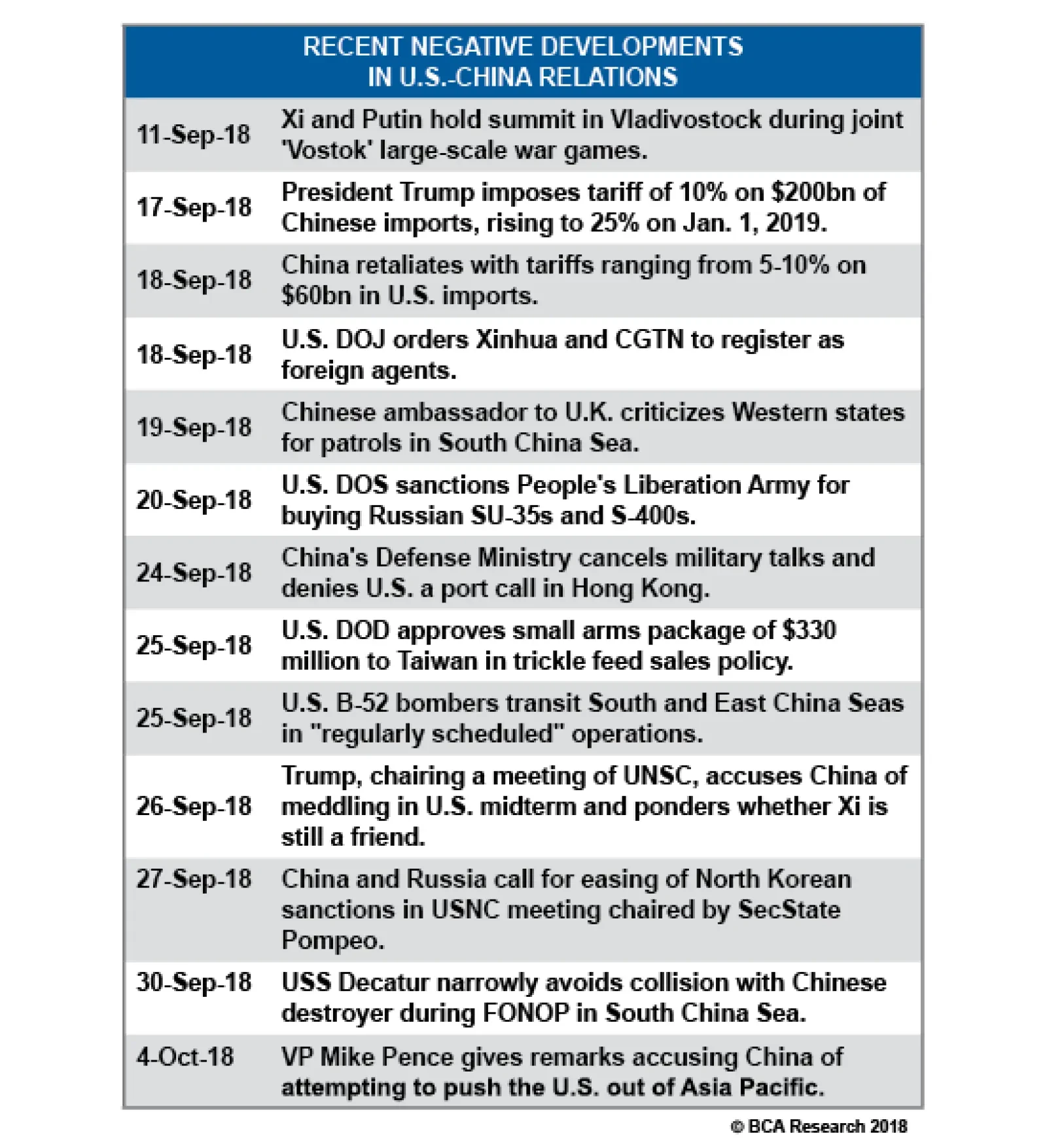 Russia is a low-cost gas producer in Europe and will be committed to maintaining its market in Europe. However, with U.S. LNG export capacity potentially reaching ~14 Bcf/d by 2025, from ~3 Bcf/d today, it is entirely likely that Russia will find itself in a price war defending existing market share in Europe at lower prices. Its preferred way of doing business, via oil price indexed contracts, will be challenged overnight by a surge in U.S. LNG imports. Bottom line: The EU and its member states are actively diversifying gas supply sources away from Russia via U.S. LNG purchases. This will lower the marginal price of all gas bought and sold in Europe, all else equal, resulting in lower margins for all sellers of gas and better prices for consumers. Ultimately, the European natural gas market will resemble every other fully developed commodity market, operating on razor-thin margins. This means whatever rents were available in this market will be dissipated as competition increases. Investment And Geopolitical Implications The immediate investment implication of these developments is that gas producers and LNG merchants with access to U.S. shale-gas supplies, processing trading, and risk-management capabilities should be favored in this evolving market. Beyond the short term, however, we expect several ongoing geopolitical developments to be ossified by the flood of American LNG steaming towards European shores: Sino-Russian alliance deepens: As Russian natural gas exports to Europe stagnate, its pipeline infrastructure build-out will increase its exports to China to 3.8 Bcf/d by 2019. China will become the growth market for Russian energy producers, deepening the move between the two former Cold War foes to stabilize their relationship. Although it may seem obvious that Russia would retain leverage in such a relationship - given that it can "turn off the lights" to Beijing at whim - we actually think that Beijing will hold all the cards.9 Europe will have an incentive to keep diversifying its natural gas supplies. Meanwhile, Chinese demand is likely to keep growing. As such, China will become Russia's main option for revenue growth. And as the old adage goes, the customer is always right. Trans-Atlantic alliance deepens: Despite the fears that the "Trump Doctrine" would lead to American isolationism - fears that we shared in 2017 - the growing U.S.-European LNG connection will ensure that the Trans-Atlantic alliance - forged 70 years ago in blood - will be saved via brisk energy trade.10 A growing European energy deficit with the U.S. will also resolve - or at least alleviate - the main source of marital problems in the relationship: Europe's trade surplus. Bifurcation of capitalism: A key theme of BCA's Geopolitical Strategy is that the age of globalization will yield to the world's segmentation into spheres of influence.11 A deepening Trans-Atlantic alliance, when combined with a budding Sino-Russian relationship, will lead to a Bifurcated Capitalism system where the Trans-Atlantic West faces off against the Eurasian East. What would such a Bifurcated Capitalism mean for investors? Time will tell. But it may mean that thirty years of global capitalism (1985 to roughly today) may give way to something more common in human history: a world dissected into spheres of influence where flows of capital, goods, and people within spheres are relatively smooth and unencumbered, yet flows between the spheres are heavily impeded. Marko Papic, Senior Vice President Chief Geopolitical Strategist marko@bcaresearch.com Hugo Bélanger, Senior Analyst Commodity & Energy Strategy HugoB@bcaresearch.com Robert P. Ryan, Senior Vice President Commodity & Energy Strategy rryan@bcaresearch.com Pavel Bilyk, Research Associate Commodity & Energy Strategy pavelb@bcaresearch.com 1 Please see "U.S. Set To Disrupt Global LNG Market," published by BCA Research's Commodity & Energy Strategy October 4, 2018. It is available at ces.bcaresearch.com. 2 Please see "The Price of Permian Gas Pipeline Limits," by Stephen Rassenfoss, in the Journal of Petroleum Technology, published July 19, 2018. 3 Following a two-year pause in project Final Investment Decisions (FIDs) from 2016 to 2017, potential FIDs in 2018 and 2019 could increase the U.S. capacity to ~ 14 Bcf/d by 2025. This will make the U.S. the second-largest exporter of LNG in the world, surpassing Australia. This new wave of investment is yet to be finalized. Therefore, final decisions in 2H18 and 2019 will be crucial to determine the medium-term potential of U.S. LNG. 4 Cheniere Energy, the largest U.S. LNG exporter, expects ~ 50% of its exports to go to Europe, according to S&P Global Platts. Please see "US LNG vs Pipeline Gas: European Market Share War?" published April 2017 by Platts. 5 Additionally, if the Baltic Pipe Project, moving gas from Norway to Poland, reaches FID in 2019, this would help Poland diversify its energy supply from Russia, as the country would cover close to all its domestic demand via its production + LNG and new pipeline imports. 6 Please see "US and Russia step up fight to supply Europe's gas," published by the Financial Times August 3, 2017. See also "Russia's gas still a potent weapon," also published by the FT, re the so-called collateral damage suffered by Europe when Russia cut off gas supplies to Ukraine in January 2009. 7 For the EU, supply diversification is a particularly important goal. On July 25, 2018, the European Commission and the U.S. issued a joint statement, in which the EU agreed to import more LNG from the U.S. "to diversify and render its energy supply more secure. The EU and the U.S. will therefore work to facilitate trade in liquefied natural gas," according to a press release issued August 9, 2018, by the Commission. Re Japan's diversification strategy, please see "Feature: US LNG sources fit with Japan's desire for route diversity: minister," published by S&P Global Platts September 27, 2018. 8 Please see Darrell 