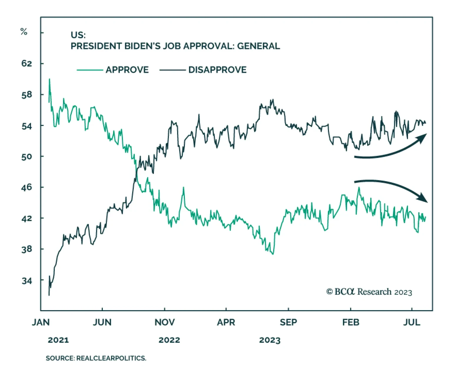 President Joe Biden’s approval rating trended down from a peak in February this year of 45.8% to the current level of 42.1%. Meanwhile his disapproval rating rose from a trough of 50.9% to its current 54.3%. The negative…