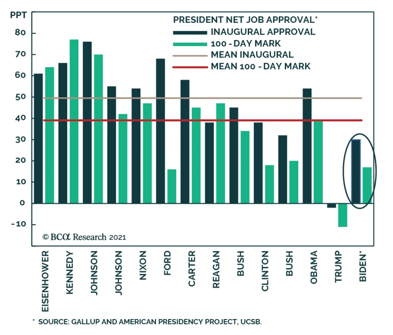 BCA Research’s US Political Strategy service believes that President Biden’s political capital is high enough for him to accomplish a major legislative achievement. President Biden’s popularity is “fair…