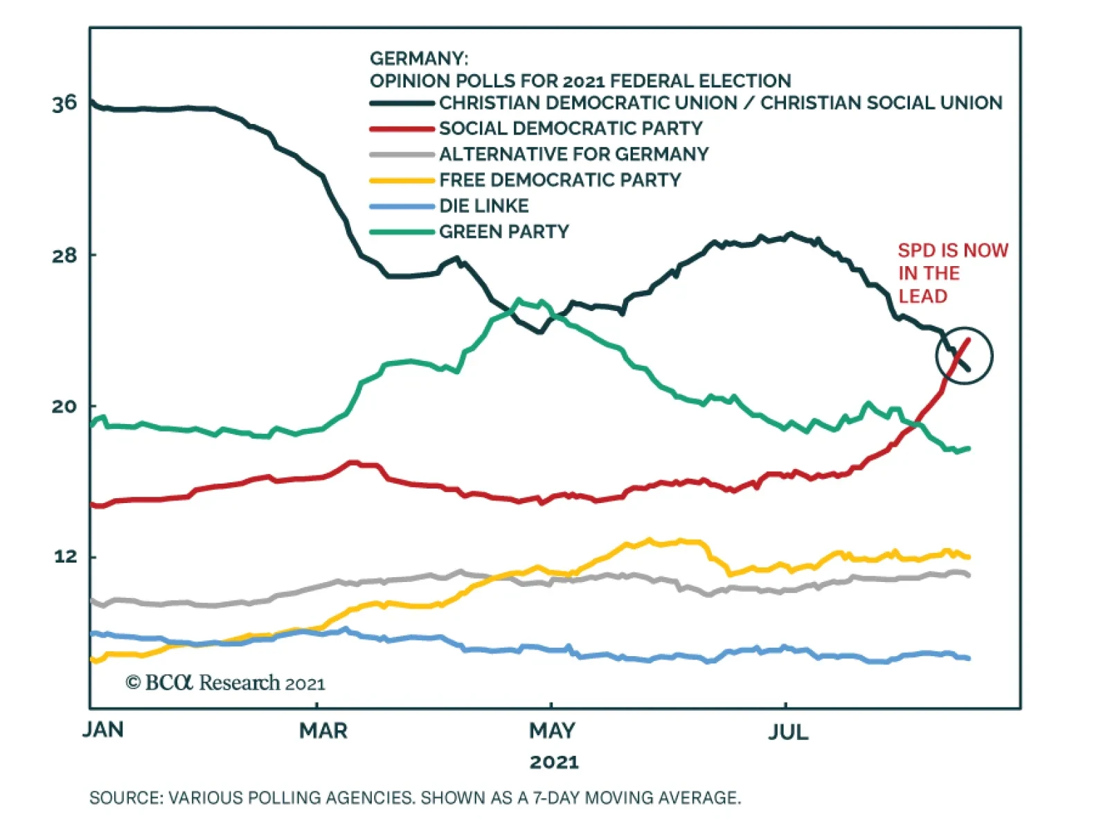 Germany's center-left Social Democrats (SPD) have jumped ahead of Merkel's conservative Christian Democratic Union/Christian Social Union (CDU/CSU) bloc and are now leading in opinion polling for the upcoming September 26…