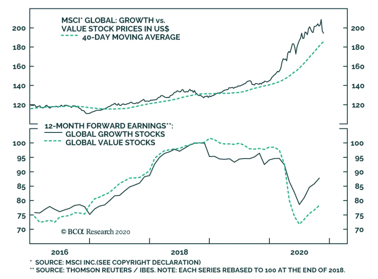 The chart above highlights the relative performance of global growth versus value stocks in the first panel, and relative forward earnings for each index in the bottom panel. The chart highlights how the outperformance of growth versus value has at least…