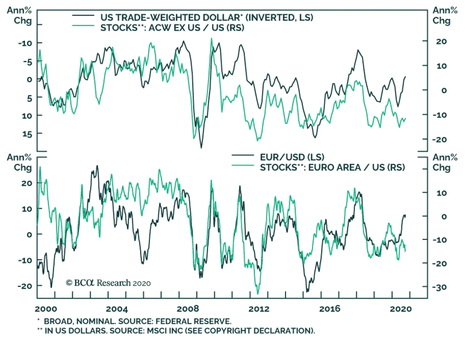 Favor Non-US And Value Stocks Non-US stocks typically outperform their US peers when the dollar is weakening (Chart 5). This partly stems from the fact that cyclical stocks are overrepresented in stock markets outside of the United States. It also reflects the fact that cash flows denominated in say, euros or yen, are worth more in dollars if the value of the dollar declines. Chart 5A Weaker Dollar Tends To Benefit Cyclical And Non-US Stocks