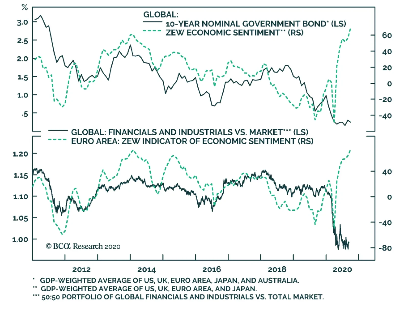 Will Low Interest Rates Lead To Malinvestment? A drop in interest rates may seem like a free lunch for shareholders: It increases the present value of future cash flows without reducing the cash flows themselves. In fact, one could argue that lower rates actually increase future cash flows by shrinking net interest payments on outstanding debt. That might be all fine and dandy, but what about the effect of low interest rates on future investment decisions? To the extent that lower rates increase the market value of a firm’s capital stock relative to its replacement cost – the so-called Tobin’s Q ratio – lower rates could spur more investment. Higher investment, in turn, could drive down the rate of return on capital, leading to lower profits (Box 2 illustrates this point with a simple example featuring a lemonade stand). While there is some truth to this logic, it is less compelling than it once was. This is because much of the capital stock of listed companies today takes the form of intangible capital – which is often difficult to reproduce – rather than physical capital. Such intangible capital may include patents and trademarks as well as monopoly power. In particular, internet companies have gained significant monopoly power from network effects: The more people use their service, the more valuable their service becomes. This is a key reason why falling interest rates have helped the tech giants more than other companies. The Path Ahead The section above argued that today’s low bond yields do, in fact, provide a reliable estimate of the risk-free component of the discount rate; that the drop in yields over the past year mainly reflects higher private-sector savings and easier monetary policy rather than pessimism about growth and earnings; and that instead of leading to overinvestment, the main effect of falling interest rates, at least so far, has been to inflate the rents earned by companies with monopoly power. All this means that lower interest rates really do justify higher market valuations. Looking out, while bond yields are unlikely to rise significantly over the next two years in the absence of any meaningful inflationary pressures, yields are unlikely to fall either given how low they already are. This is not necessarily bad news for stocks. As mentioned above, the equity risk premium is quite high, which means that stocks can rise even if bond yields do edge somewhat higher. The more interesting action is likely to occur beneath the broad indices. If bond yields stabilize, this will remove a major headwind to bank shares (Chart 10). On the flipside, the reopening of economies will benefit companies that were crushed by lockdown measures. Money will shift from “pandemic plays” to “recovery plays.” Chart 10Stabilization In Bond Yields Would Remove A Major Headwind To Bank Shares