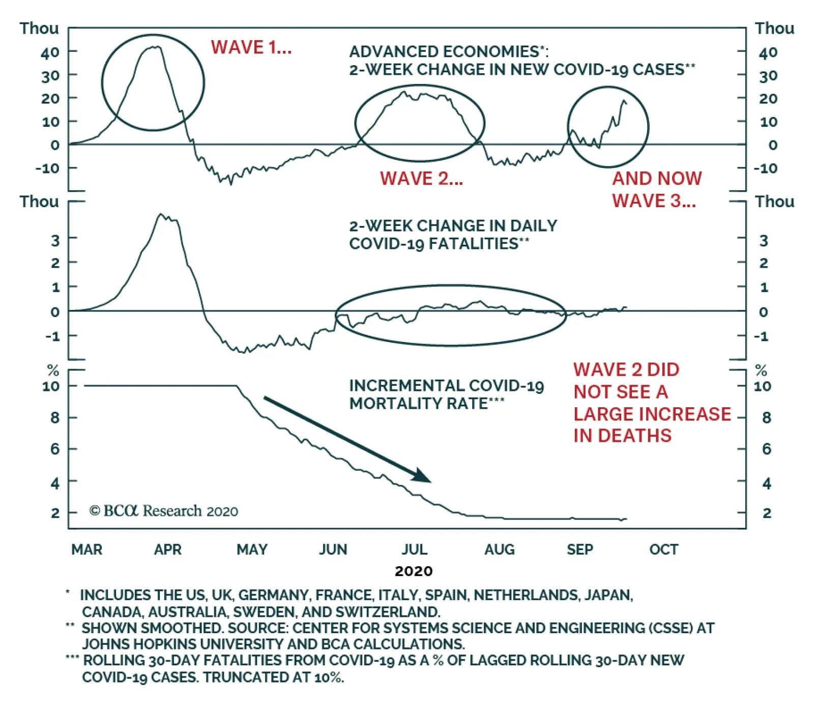 We continue to favor global equities over bonds on a 12-month horizon. However, stocks remain technically overbought in the short term despite correcting modestly over the past few weeks. Tech stocks rallied hard into September. Aggressive buying of out-of-the-money call options helped fuel the rally. While some big institutional players such as Softbank have reportedly scaled back their positions, many retail investors remain unfazed. The triple leveraged long Nasdaq 100 ETF, TQQQ, experienced the largest weekly inflow on record in September. In addition to being technically stretched, equities face near-term risks from the impasse in the US Congress over a new stimulus bill. Investors are not fully appreciating the degree to which fiscal policy has already tightened in the US. Chart 1 shows that weekly unemployment payments have fallen by $15 billon since the end of July, representing a drop of more than 50%. At an annualized rate, this amounts to 3.7% of GDP in fiscal tightening. On top of that, the funds in the small business Paycheck Protection Program have run out, while many state and local governments face a severe cash crunch. BCA’s geopolitical strategists expect a fiscal deal to be reached over the next few weeks. The fact that Speaker Nancy Pelosi has said that Congress will stay in session until both sides agree on an aid package is good news in that regard. Nevertheless, given all the acrimony in Washington in the run up to the November election, there is still a non-negligible chance that a deal falls through. Why, then, are we still bullish on stocks on a 12-month horizon? Partly it is because voters want more stimulus, which means that fiscal policy is likely to be loosened again, even if this does come after the election. It is also because the pandemic seems to be receding. While the number of new cases is rising again in the EU and some other regions, fatality rates remain much lower than during the first wave. Progress also continues to be made on developing a viable vaccine. According to The Good Judgment Project, about 60% of “superforecasters” expect a mass-distributed vaccine to be available by Q1 of 2021, up from 45% just four weeks ago. Only 2% expect there to be no vaccine available by April 2022, down from over 50% in May (Chart 2). Chart 2High Odds Of A Vaccine Within 6-To-12 Months