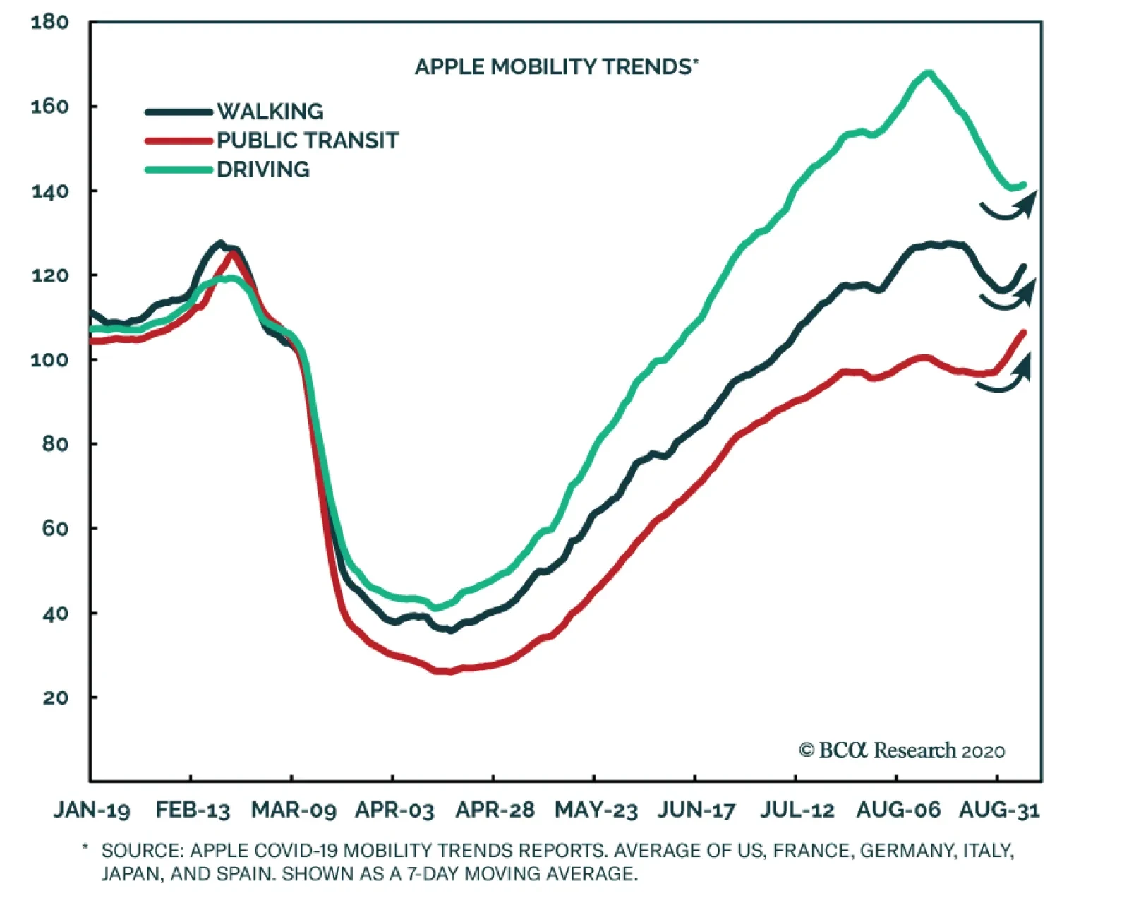The rolling second wave of infections between the US, Europe and Japan has done little more than to flatten the curve of mobility in recent months. In fact, the August vacations in Europe had a more pronounced effect on driving patterns for advanced economies…