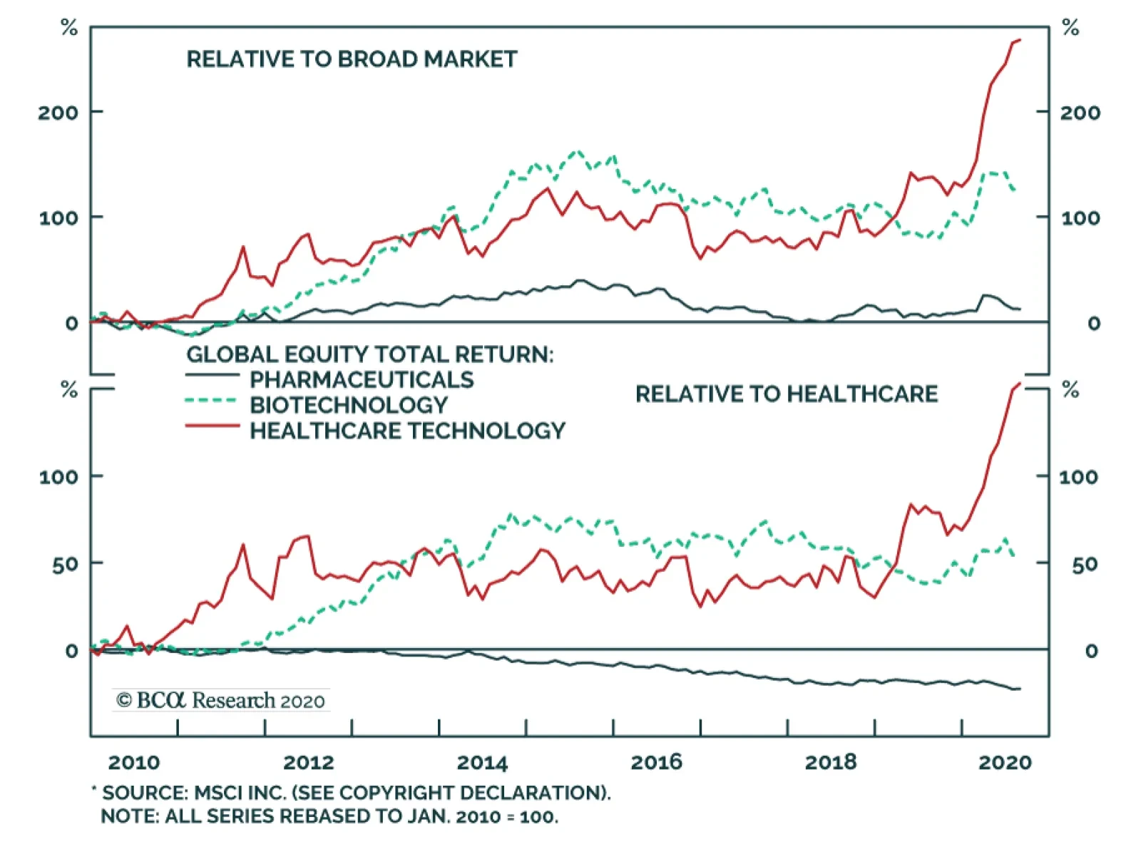 But it is hard to predict the winners from this shake-out. Overall spending by consumers is unlikely to be significantly affected, so it is a matter of forecasting which companies and formats will emerge victorious. Will Walmart and Target and other large retail chains improve their online offering to fight back against Amazon? Facebook, Shopify, and others have set up new services to compete with Amazon on price – will they be successful? Will small stores start to win back market share? Will supermarkets figure out how to make profits from their order-online-and-deliver services (which are now very costly because most often a human has to run around the store picking out the items ordered), or will new, fully automated competitors emerge? Will new technologies materialize to make it easier to buy clothes online (for example, digitized body measuring systems)? These changes will also affect producers of consumer products. They will have to understand the new channels, and adapt their offerings and positioning strategies accordingly. These changes will make the sector a tricky one. A skilled fund manager might be able to predict which companies’ strategies will be successful. But it could be a problematic area for investors owning individual stocks within the sector who do not have detailed expertise. Garry Evans, Senior Vice President Global Asset Allocation garry@bcaresearch.com Footnotes 1 Please see The Bank Credit Analyst, "Beyond The Virus," dated May 22, 2020 and Geopolitical Strategy, "Nationalism And Globalization After COVID-19," dated June 26, 2020. 2 Peter E. Drucker, "The Ecological Vision: Reflections on the American Condition," 1993, p.340. 3 Jonathan I. Dingel and Brent Neiman, "How Many Jobs Can Be Done At Home?" NBER Working Paper No. 26948, April 2020. 4 OWL Labs, “The State of Remote Work Report,” available at www.owllabs.com. 5 Pew Research Center survey conducted March 19-24 2020. Please see https://www.pewsocialtrends.org/2020/03/30/most-americans-say-coronavirus-outbreak-has-impacted-their-lives/psdt_03-30-20_covid-impact-00-4/ 6 Gajendran, R.S., & Harrison, D.A., “The Good, the Bad, and the Unknown about Telecommuting”, Journal of Applied Psychology 92(6), 2007. 7 Nicholas Bloom, James Liang, John Roberts & Zhichun Jenny Ying, “Does Working from Home Work? Evidence From a Chinese Experiment,” The Quarterly Journal of Economics (2015), 165-218. 8 Please see educationdata.org. 9 Ateev Mehrotra, Michael Chernew, David Linetsky, Hilary Hatch, and David Cutler, "The Impact of the COVID-19 Pandemic on Outpatient Visits: A Rebound Emerges," The Commonwealth Fund, dated May 19, 2020. 10For more on the long-term outlook for the health care sector, Global Asset Allocation Special Report, "The Healthcare Revolution: The Case For Staying Overweight," dated July 24, 2020, available at gaa.bcaresearch.com. 11Please see Global Asset Allocation Special Report, "The Healthcare Revolution: The Case For Staying Overweight,"dated July 24, 2020, available at gaa.bcaresearch.com.