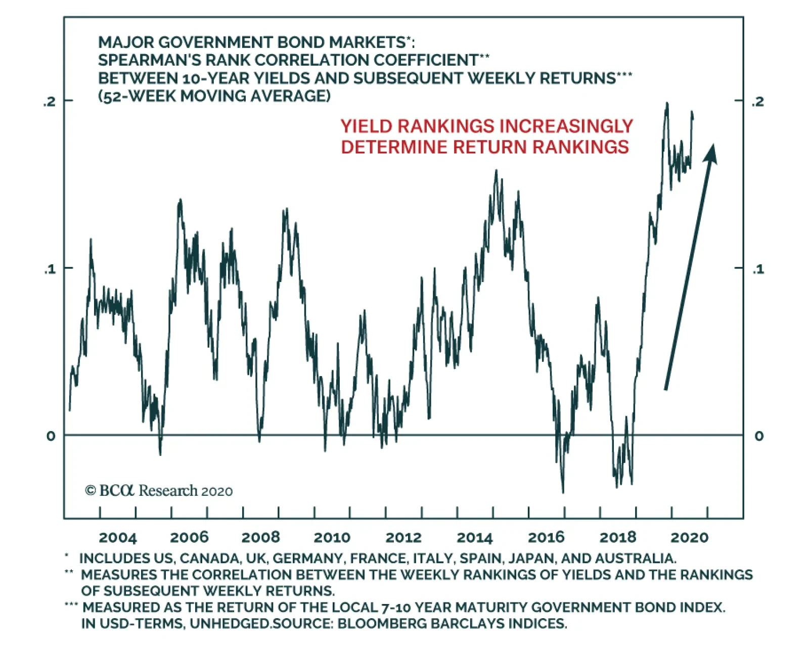 In Chart 5, we show the 2020 year-to-date government bond returns, for the 7-10 year maturity bucket, for the countries we include in our model bond portfolio (the US, Germany, France, Italy, Spain, the UK, Japan, Canada and Australia). The returns are shown both currency unhedged (in USD terms) and hedged into US dollars, with the yield levels from the start of 2020 shown at the top of each bar. The ranking of the returns does generally follow the ranking of yields at the start of the year – the US, Canada, Australia and Italy outperforming low-yielding Germany, France and Japan. What is more interesting is how that correlation between yield levels and performance has evolved over the course of 2020, and even dating back to 2019. If a dynamic of strict yield chasing behavior was gaining steam, then the performance rankings of government bonds should increasingly reflect the rankings of available yields. One way to measure such a dynamic is with a statistic called a Spearman’s rank correlation. Simply put, the Spearman’s rank shows the correlation between the rankings of two sets of variables within each set, rather than the correlation of the variables themselves. If the correlation between the rankings is increasing, this suggests that the relationship between the two variables is becoming more dependent on the levels of the variables relative to each other. We present the Spearman’s rank correlation between yield levels and subsequent bond returns for the nine countries in our model bond portfolio universe in Chart 6. Weekly correlations are calculated using the ranking of the 10-year government bond yields from those nine countries and the rankings of the subsequent weekly total returns (currency unhedged) for those same markets. We present a rolling 52-week correlation coefficient in the chart, which shows a steadily rising trend over the past year of relative bond market performance becoming more dependent on relative initial yield levels. Chart 6High' Yielders Are The Winners In A Low-Yield Environment