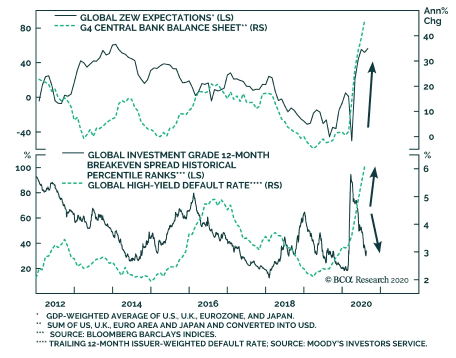 Global credit markets have enjoyed a spectacular recovery from the carnage seen just five months ago when investors realized the magnitude of the COVID-19 shock. The option-adjusted spread (OAS) on the Bloomberg Barclays Global Investment Grade Corporate index has tightened from the 2020 high of 326bps to 130bps, while the OAS on the Global High-Yield index has narrowed from the 2020 high of 1192bps to 556bps. Unsurprisingly, those spread peaks both occurred on the same day: March 23, the day the US Federal Reserve announced their corporate bond buying programs. We have described the Fed’s actions as effectively removing the “left tail risk” of investing in credit, and not just in the US, by introducing a central bank liquidity backstop to the US corporate bond market. The backdrop for global credit markets, on the surface, seems typical for sustained spread compression (Chart of the Week). Economic optimism is buoyant, with the global ZEW expectations index now at the highest level since 2014. Monetary conditions are highly supportive, with near-0% policy rates across all developed economies and the balance sheets of the Fed, ECB, Bank of Japan and Bank of England growing at a combined year-over-year pace of 46%. Credit markets seem to be signaling boom times ahead, ignoring the pesky details of an ongoing global pandemic and election-year political uncertainty in the US. Credit markets seem to be signaling boom times ahead, ignoring the pesky details of an ongoing global pandemic and election-year political uncertainty in the US. The next moves in credit will be more challenging and less rewarding than the past five months. Investment grade corporate credit spreads no longer offer compelling value in most developed economies, while high-yield spreads are tightening in the face of rising default rates in the US and Europe. While additional spread tightening is not out of the question in these markets, investors should consider rotating into credit sectors that still offer some relative value – like emerging market (EM) hard currency corporates. A World Tour Of Our Spread Valuation Indicators The sharp fall in global bond yields over the past several months has not just been confined to government debt. Yields have fallen toward, and even below, pre-virus lows for a variety of sectors ranging from US mortgage-backed securities (MBS) to EM USD-denominated sovereign debt (Chart 2). Investors are clearly reaching for yield in the current environment of tiny risk-free government bond yields, with no greater sign of this than the recent new issue by a US sub-investment grade borrower of a 10-year bond with a coupon below 3%.1 The drop in credit yields has also occurred alongside tightening credit risk premiums, although spreads remain above the pre-virus lows for most sectors in the US, Europe and EM (Chart 3). The degree of correlation across global credit markets has been intense, with very little differentiation between countries. Investment grade corporate spreads in the US, UK and euro area are all closing in on 100bps; high-yield spreads in those same regions are all around 500bps. Chart 2Global Credit Yields Are Low
