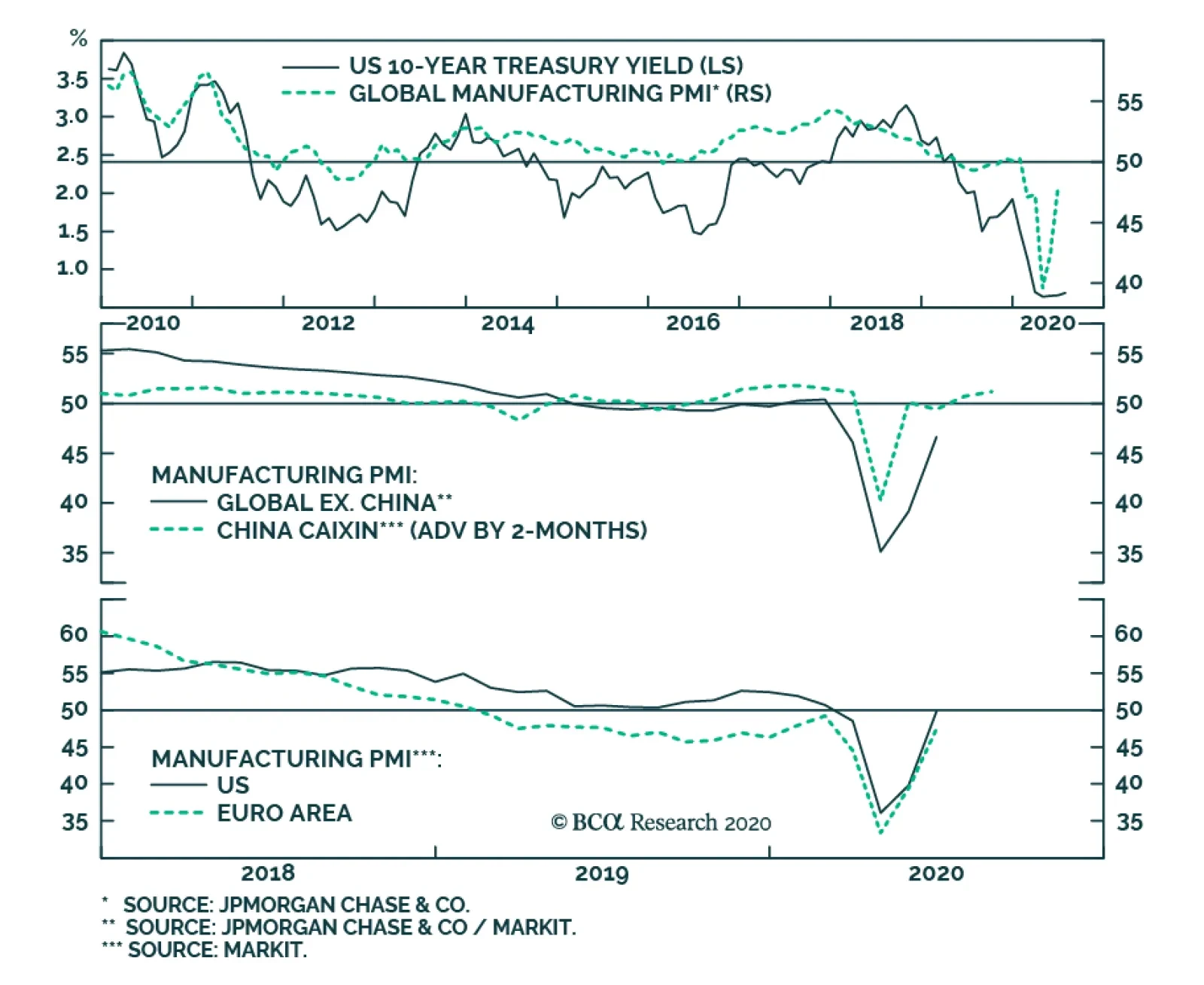 The coronavirus pandemic is not over. Enormous fiscal and monetary stimulus will soften the blow to the global economy, but there remain significant risks to growth over the next 12 months. The P/E ratio for global equities is near a record high. This suggests that the market is pricing in a V-shaped recovery, and ignoring the risks. We can, therefore, recommend no more than a neutral position on global equities. But government bonds are even more expensive, with yields having largely hit their lower bound. Stay underweight government bonds, and hedge downside risk via cash. The US dollar is likely to depreciate further: It is expensive, US liquidity has risen faster than elsewhere, interest-rate differentials no longer favor it, and momentum has swung against it. A weakening dollar – plus accelerating Chinese credit growth – should help commodities. We raise the Materials equity sector to neutral, and put Emerging Market equities on watch to upgrade from neutral. Corporate credit selectively remains attractive where central banks are providing a backstop. We prefer A-, Baa-, and Ba-rated credits, especially in the Financials and Energy sectors. Defensive illiquid alternative assets, such as macro hedge funds, have done well this year. But investors should start to think about rotating into private equity and distressed debt, where allocations are best made mid-recession. Overview Cash Injections Vs. COVID Infections The key to where markets will move over the next six-to-nine months is (1) whether there will be a second wave of COVID-19 cases and how serious it will be, and (2) how much appetite there is among central banks and fiscal authorities to ramp up stimulus to offset the damage the global economy will suffer even without a new spike in cases. A new wave of COVID-19 in the northern hemisphere this fall and winter is probable. It is not surprising, after such a sudden stop in global activity between February and May, that economic data is beginning to return to some sort of normality. PMIs have generally recovered to around 50, and in some cases moved above it (Chart 1). Economic data has surprised enormously to the upside in the US, although it is lagging in the euro zone and Japan (Chart 2). Chart 1Data Is Rebounding Sharply