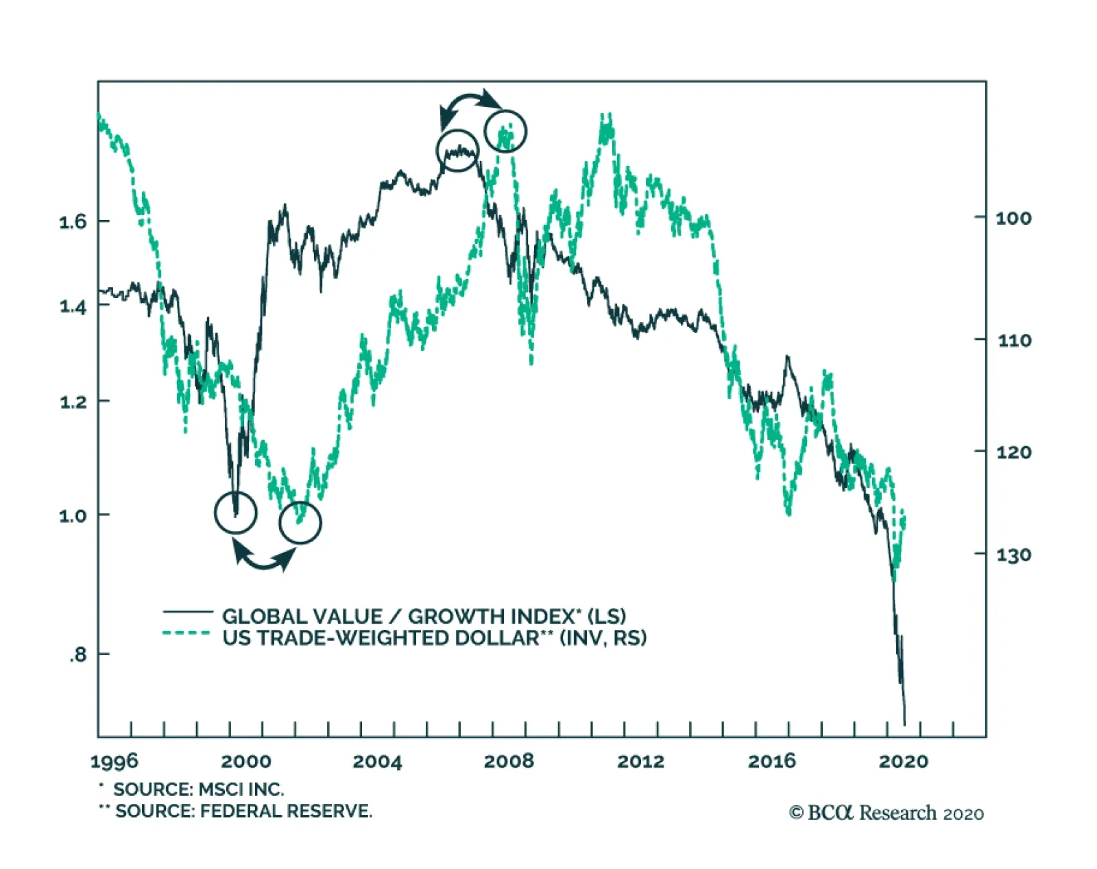 BCA Research's Foreign Exchange Strategy and Equity Trading Strategy services conclude that the underperformance of value versus growth has been an important contributor to the dollar’s strength. Two trends become apparent when plotting the global value…