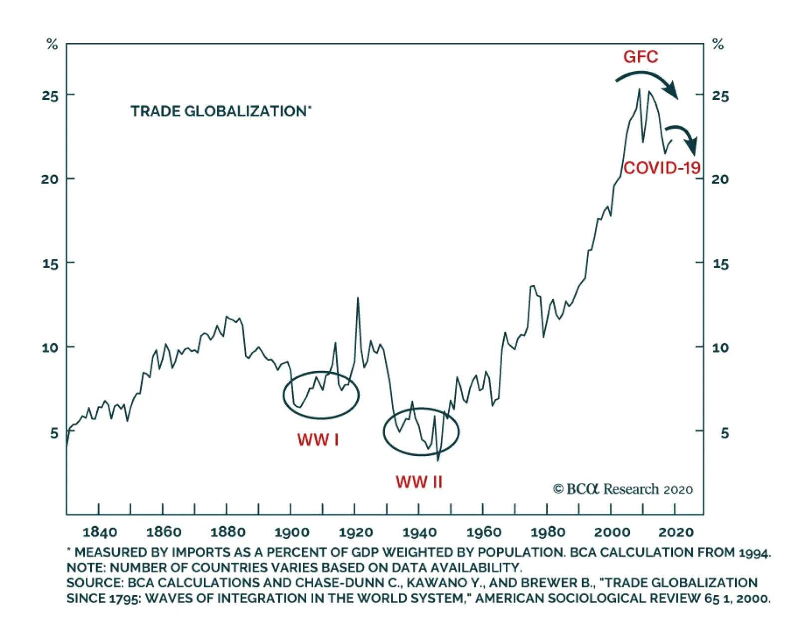 COVID-19 is the latest economic shock that will feed a new round of nationalism. At least 750 million people are extremely vulnerable across the world, mostly concentrated in the shatter belt from Libya to Turkey, Iran, Pakistan, and India.2 Instability will generate emigration and conflict. Once again the global oil supply will be at risk from Middle Eastern instability and the dollar will eventually fall due to gargantuan budget and trade deficits. Today’s shock will differ, however, in the way it knocks against globalization, a process that has already begun to slow. Specifically, this crisis threatens to generate instability in East Asia – the workshop of the world – due to the strategic conflict between the US and China. This conflict will play out in the form of “proxy battles” in Greater China and the East Asian periphery. The dollar’s recent weakness is a telling sign of the future to come. In the short run, however, political and geopolitical risks are acute and will support safe havens. Globalization In Retreat Nationalism is not necessarily at odds with globalization. Historically there are many cases in which nationalism undergirds a foreign policy that favors trade and eschews military intervention. This is the default setting of maritime powers such as the British and Dutch. Prior to WWII it was the American setting, and after WWII it was the Japanese. Over the past thirty years, however, the rise of nationalism has generally worked against global trade, peace, and order. That’s because after WWII most of the world accepted internationalist ideals and institutions promoted by the United States that encouraged free markets and free trade. Serious challenges to that US-led system are necessarily challenges to global trade. This is true even if they originate in the United States. Globalization has occurred in waves continuously since the sixteenth century. It is not a light matter to suggest that it is experiencing a reversal. Yet the best historical evidence suggests that global imports, as a share of global output, have hit a major top (Chart II-6).3 The line in this chart will fall further in 2020. American household deleveraging, China’s secular slowdown, and the 2014 drop in oil and commodities have had a pervasive impact on the export contribution to global growth. Chart II-6Globalization Hits A Major Top