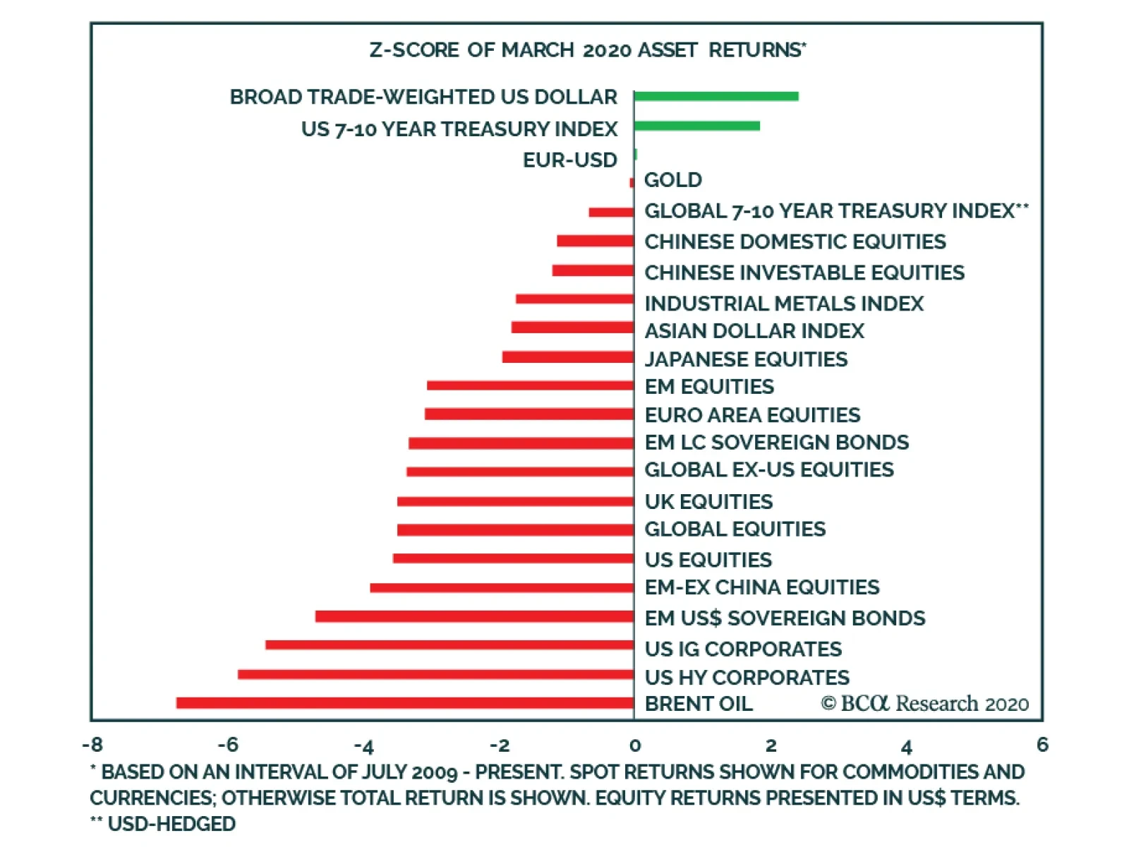 The chart above presents the March monthly returns of a variety of important financial assets, shown as the number of standard deviations from the average that has prevailed since the end of the Great Recession in 2009. Several points are noteworthy: The…