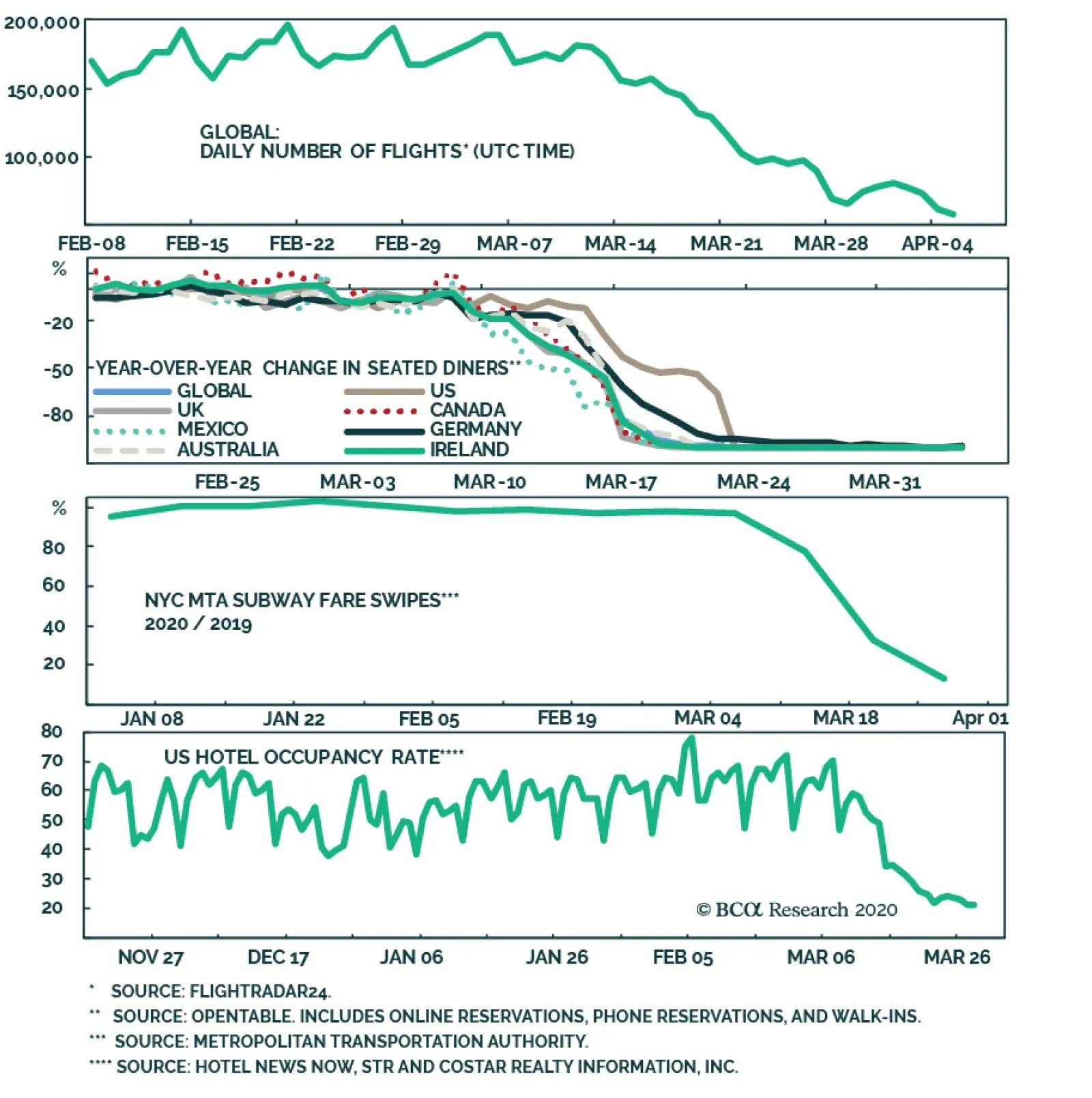 Highlights Global growth should bounce back in the third quarter, as mass COVID-19 testing allows more people to return to work. Temporary layoffs have accounted for the vast majority of the increase in unemployment so far. Ample fiscal and monetary support should prevent these layoffs from becoming permanent. The equity risk premium remains quite high, which warrants overweighting equities relative to bonds over a 12-month horizon. The near-term outlook for stocks is less flattering, given the strong rally in equities over the past two weeks and the fact that earnings estimates are likely to fall sharply once companies begin to report first quarter results. Accordingly, we recommend that investors take some chips off the table in preparation for a temporary stock market pullback. We are also shifting our near-term regional equity allocation and currency views in a somewhat more defensive direction. As Bad As It Gets? Chart 1Nosedive In High-Frequency Activity Indicators