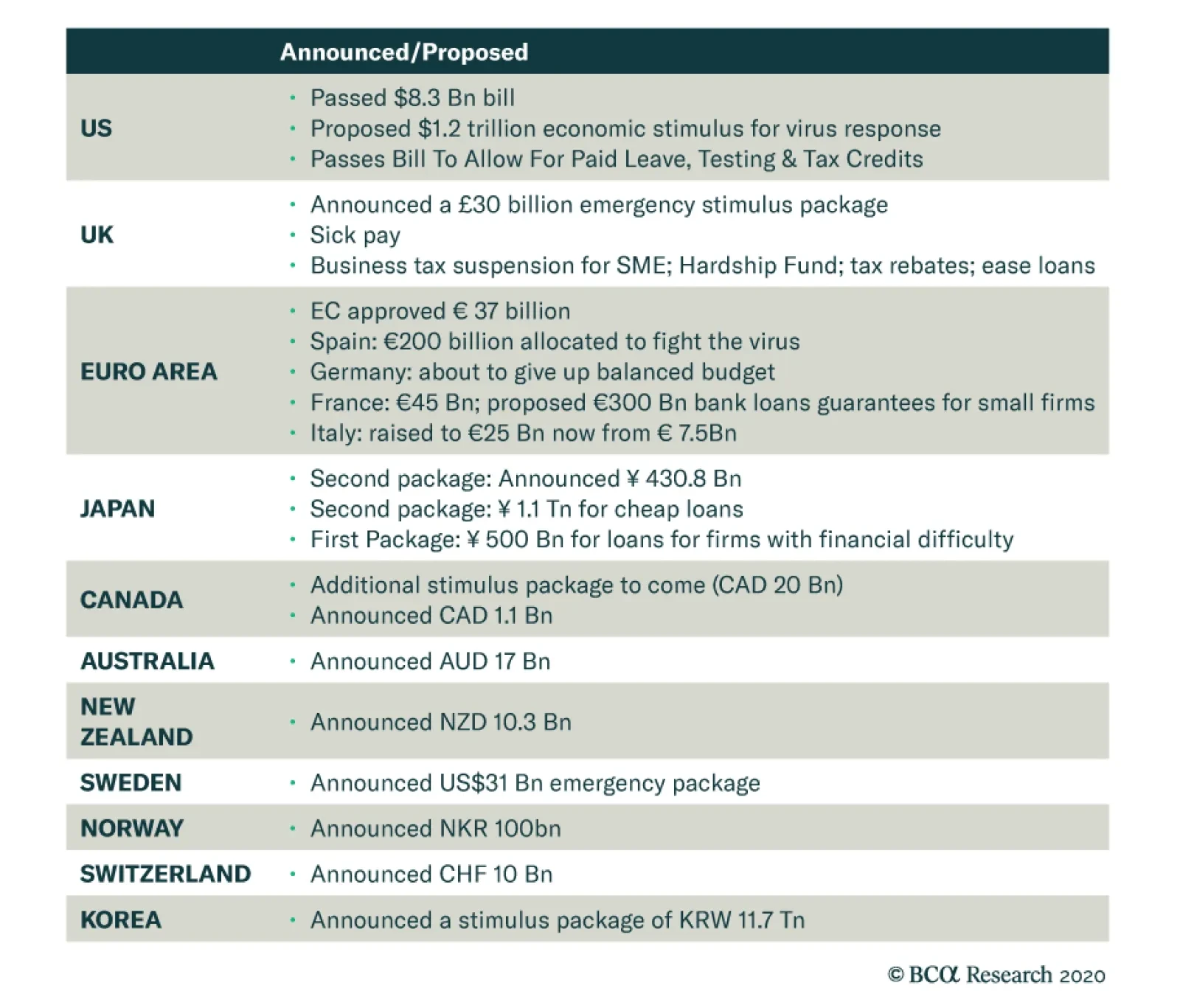 Euro Area The European Central Bank (ECB) unexpectedly made no changes to policy interest rates last week. It opted instead to increase asset purchases by €120bn until the end of 2020 (both for government bonds and investment grade corporates), while introducing more long-term refinancing operations (LTROs) to “provide a bridge” to the targeted LTRO (TLTRO-3) that is set to begin in June. The terms of TLTRO-3 were improved, as well; banks that accessed the liquidity to maintain existing lending could do so at a rate up to -25bps below the current ECB deposit rate of -0.5%, for up to 50% of the existing stock of bank loans. The ECB obviously had to do something, given the coordinated nature of the global monetary policy response to COVID-19. Yet the decisions taken show that the ECB is much more limited in its ability to ease policy further, with interest rates already negative, asset purchases approaching self-imposed country limits and, most worryingly, inflation expectations falling to fresh lows (Chart 5). The bigger responses to date have come on the fiscal front, with stimulus packages proposed by France (€45bn), Italy (€25bn), Spain (€3bn) and the European Commission (€37bn). The biggest news, however, came from Germany which has offered affected businesses tax breaks and cheap loans through the state development bank, KfW – the latter with an planned upper limit of €550bn (and with the German government assuming a greater share of risk on those new KfW loans). The German government has also vaguely promised to temporarily suspend its so-called “debt brake” to allow deficit financing of virus-related stimulus programs, if necessary. Other Countries The Bank of England cut interest rates by -50bps last week, while also lowering capital requirements for UK banks by allowing use of counter-cyclical buffers for lending. On the fiscal side, a £30bn package was introduced last week that included a tax cut for retailers, cash grants to small business, sick pay for those with COVID-19 and extended unemployment benefits. The Bank of Japan held an emergency meeting this past Sunday night, announcing no changes in policy rates but doubling the size of its ETF purchase program to $56 billion a year to $112 billion, while also increasing purchases of corporate bonds and commercial paper. The central bank also announced a new program of 0% interest loans to increase lending to businesses hurt by the virus. The Bank of Canada delivered an emergency -50bps cut in its policy rate last Friday, coming soon after the -50bp reduction from the previous week. The central bank also introduced operations to boost the liquidity of Canadian financial markets. The Canadian government also announced a fiscal package of up to C$20bn, including increased money for the state business funding agencies. The Reserve Bank of Australia did not cut its Cash Rate last week, which was already at a record-low 0.5%. It did, however, signal that it would begin a quantitative easing program for the first time, and introduce Fed-like repo operations, to provide more liquidity to the economy and local financial markets. The Australian government has also announced A$17bn of fiscal stimulus. Fiscal packages have also been introduced in New Zealand (where the Reserve Bank of New Zealand just cut its policy rate by -75bps), Sweden, Switzerland, Norway, and South Korea. To date, China has leaned more on monetary and liquidity measures – lowering interest rates and cutting reserve requirements – rather than a big fiscal stimulus package. Will all these policy measures be enough to offset the hit to global growth from COVID-19 and help stabilize financial markets? It is certainly a good start, particularly in countries with low government and deficit levels that have the fiscal space for even more stimulus, like Germany, Australia and Canada (Chart 6). Given these competing forces of global recession and monetary policy exhaustion on one side, but with increasingly more expansive fiscal policy on the other, we recommend a neutral (at benchmark) stance on overall global duration exposure on both a tactical and strategic basis. The ability to calibrate the necessary policy response is impossible to assess without knowing the full impact of COVID-19 pandemic on the global economy – including the size of related job losses and corporate defaults/bankruptcies. Policymakers are likely to listen to the combined message of financial markets – equity prices, credit spreads and government bond yields. The low level of yields and flat yield curves, despite near-0% policy rates across the developed world (Chart 7), suggests that investors see monetary policy as “tapped out”, leaving fiscal stimulus as the only way to fight the economic war against COVID-19. Chart 6At Global ZIRP, The Policy Focus Shifts To Fiscal