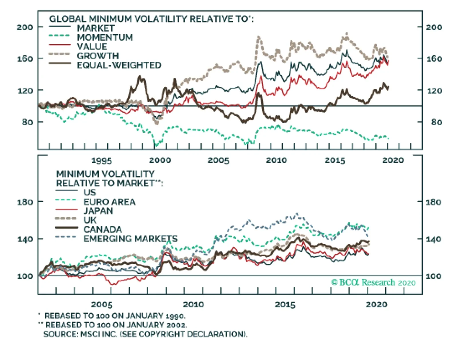 Bottom Line The low-volatility anomaly contradicts what is perhaps the most fundamental pillar in finance: The tradeoff between risk and return. As such, this anomaly might be the most puzzling inefficiency in markets. But will it persist? The evidence suggests that the anomaly is caused by strong institutional incentives, which are likely to continue. Thus, investors should strongly consider investing in low-volatility stocks in the future. However, the following points should be taken into account: Investors who are evaluated according to their information ratio should avoid low/minimum-volatility stocks, given that their large volatility difference with the benchmark will result in a relatively high tracking error. Relatively high valuations and an uptrend in interest rates may hurt the performance of low/minimum-volatility stocks relative to the broad equity market in the near future. However, the interest-rate exposure of low/minimum-volatility stocks might prove attractive to multi-asset investors. Specifically, investing in minimum-volatility equities and reducing bond exposure might be a way to boost returns while remaining hedged. Juan Correa Ossa, CFA Senior Analyst juanc@bcaresearch.com Footnotes 1 The discovery of the low-volatility anomaly predates the discovery of both the size and value anomalies. For more details, please see Michael C. Jensen, Fischer Black, and Myron S. Scholes, “The Capital Asset Pricing Model: Some Empirical Tests,” Studies in the Theory Of Capital Markets, Praeger Publishers Inc., 1972. 2 For more details on the construction of minimum-volatility portfolios, please see Tzee-man Chow, Jason C. Hsu,Li-Lan Kuo, and Feifei Li, “A Study of Low Volatility Portfolio Construction Methods,” The Journal of Portfolio Management, Vol. 40, No. 4, 2014. 3 However, research has shown that the low-volatility anomaly still holds within sectors, suggesting that its outperformance is not only a result of sector bias. For more details, please see Raul Leote de Carvalho, Majdouline Zakaria, Lu Xiao, and Pierre Moulin, “Low Risk Anomaly Everywhere - Evidence from Equity Sectors,” (November 19, 2014). 4 Please see Joost Driessen, Ivo Kuiper, Korhan Nazliben, and Robbert Beilo, “Does Interest Rate Exposure Explain the Low-Volatility Anomaly?” Journal of Banking and Finance, Vol. 103, 2019. 5 Please see Jason C. Hsu, Hideaki Kudoh and Toru Yamada, “When Sell-Side Analysts Meet High-Volatility Stocks: An Alternative Explanation for the Low-Volatility Puzzle,” Journal Of Investment Management (JOIM), Second Quarter 2013. 6 Please see Nardin L. Baker and Robert A. Haugen, “Low Risk Stocks Outperform within All Observable Markets of the World,” (April 27, 2012). 7 Please see David Blitz, “Are Hedge Funds on the Other Side of the Low-Volatility Trade?” The Journal of Alternatives Investments, Vol. 21, No. 1, Summer 2018. 8 Please see Jason C. Hsu and Vivek Viswanathan, “The Low Volatility Anomaly and the Preference for Gambling,” Risk-Based and Factor Investing, pages 291-303; (2015). 9 There is some debate as to whether the long-shot bias is truly irrational in financial markets, where payoffs and probabilities are not known with precision. 10 Researchers have found that the low-volatility anomaly exists in the government and corporate bond market. For more details please see, Raul Leote de Carvalho, Patrick Dugnolle, Lu Xiao, and Pierre Moulin, “Low-Risk Anomalies in Global Fixed Income: Evidence from Major Broad Markets,” The Journal of Fixed Income, vol. 23, No. 4, Spring 2014. 11 Please see Malcolm Baker, and Brendan Bradley, and Jeffrey Wurgler, “Benchmarks as Limits to Arbitrage: Understanding the Low-Volatility Anomaly,” Financial Analysts Journal, Vol. 67, No. 1, 2011. 12 Please see Joost Driessen, Ivo Kuiper, and Korhan Nazliben, and Robbert Beilo, “Does Interest Rate Exposure Explain the Low-Volatility Anomaly?” Journal of Banking and Finance, Vol. 103, 2019. 13 We calculate sensitivity for US stocks instead of global stocks due to the effects of currency returns. 14 Please see Global Asset Allocation Strategy Report “Safe Haven Review: A Guide To Portfolio Protection In The 2020s,” dated October 29 2019, available at gaa.bcaresearch.com.