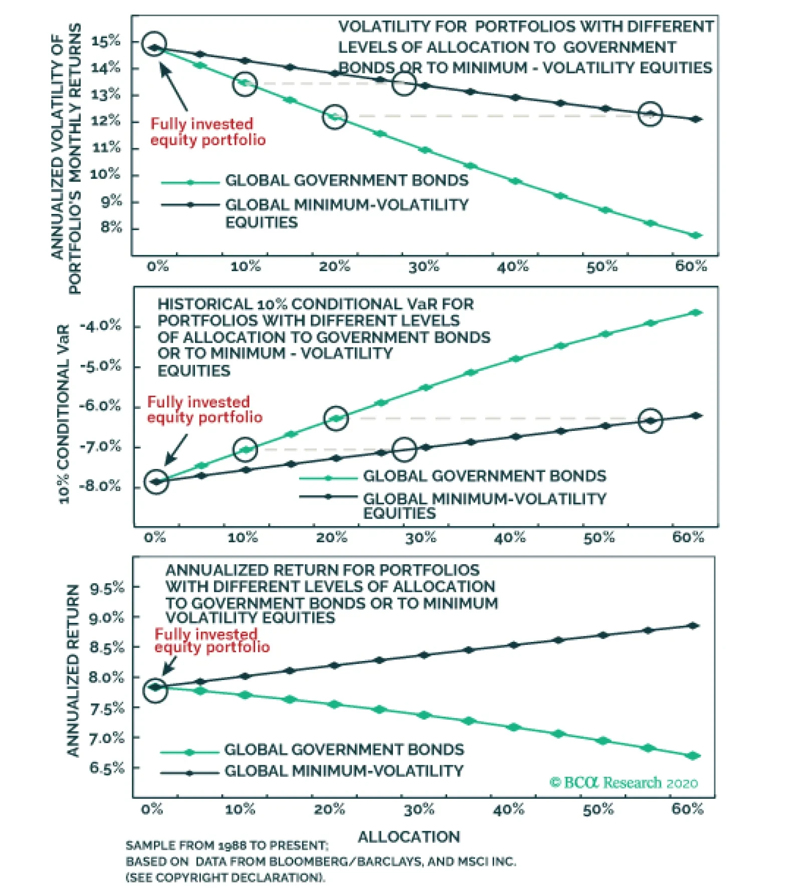 The interest rate sensitivity of low-volatility stocks has been a topic of significant interest for academic researchers. A study that attempted to measure this sensitivity found that equities in the lowest volatility decile have an interest-rate exposure equivalent to a 66% equity/34% bond portfolio.12 Moreover, this sensitivity has increased in recent years: Factor analysis shows that while the beta of the excess returns of minimum volatility to the equity market has remained constant, the beta to the bond market has increased significantly over the last decade13 (Chart 11, top panel). Interestingly this process seems to have accelerated as bond yields fell below dividend yields – a result which might arise because the market starts perceiving bonds, and low-volatility equities as close substitutes when they provide a similar cash flow (Chart 11, bottom panel). At first glance, this relatively high duration risk appears to be a red flag, particularly if you share our view that interest rates have reached a multi-year bottom. After all, an environment where interest rates rise would imply that minimum volatility would underperform global equities on a structural basis. However, the sensitivity of minimum volatility to interest rates can be used to the advantage of an asset allocator. Specifically, in a world of low bond yields, it could be attractive for an investor to shift some of the exposure he or she has from bonds to minimum-volatility equities. Why would an investor do this? As we discussed in our October 2019 report, low bond yields will cause bonds to generate returns that are much lower than their historical averages. This means that using government bonds as a hedge for an equity portfolio is likely to result in a severe drag on performance.14 On the other hand, while minimum-volatility equities do not have the same hedging potency as bonds, their returns are much higher, which suggests that at the right allocation they could prove to be a better hedge. In a world of low bond yields, it could be attractive for an investor to shift some of the exposure he or she has from bonds to minimum-volatility equities. How has such a strategy worked historically? Chart 12 shows how allocating incremental amounts of global minimum-volatility equities to an equity portfolio compares to adding incremental amounts of global government bonds. Overall, allocating an additional 3% of minimum-volatility equities to a portfolio had the same effect as adding 1% of government bonds in terms of downside protection and volatility reduction, but with a much higher return. This effect was robust throughout the sample period. Consider a portfolio with 30% government bonds, 30% minimum volatility and 40% global equities. With the exception of the 1990-1994 period, this portfolio had roughly the same 10% conditional VaR in all sub periods as a portfolio with 40% government bonds and 60% equities, but a significantly higher return (Chart 13). Moreover, the volatility of the portfolio that includes minimum volatility has also been lower than the 60/40 portfolio since 2000. Chart 12Min Vol Provides Protection With A Relatively High Return