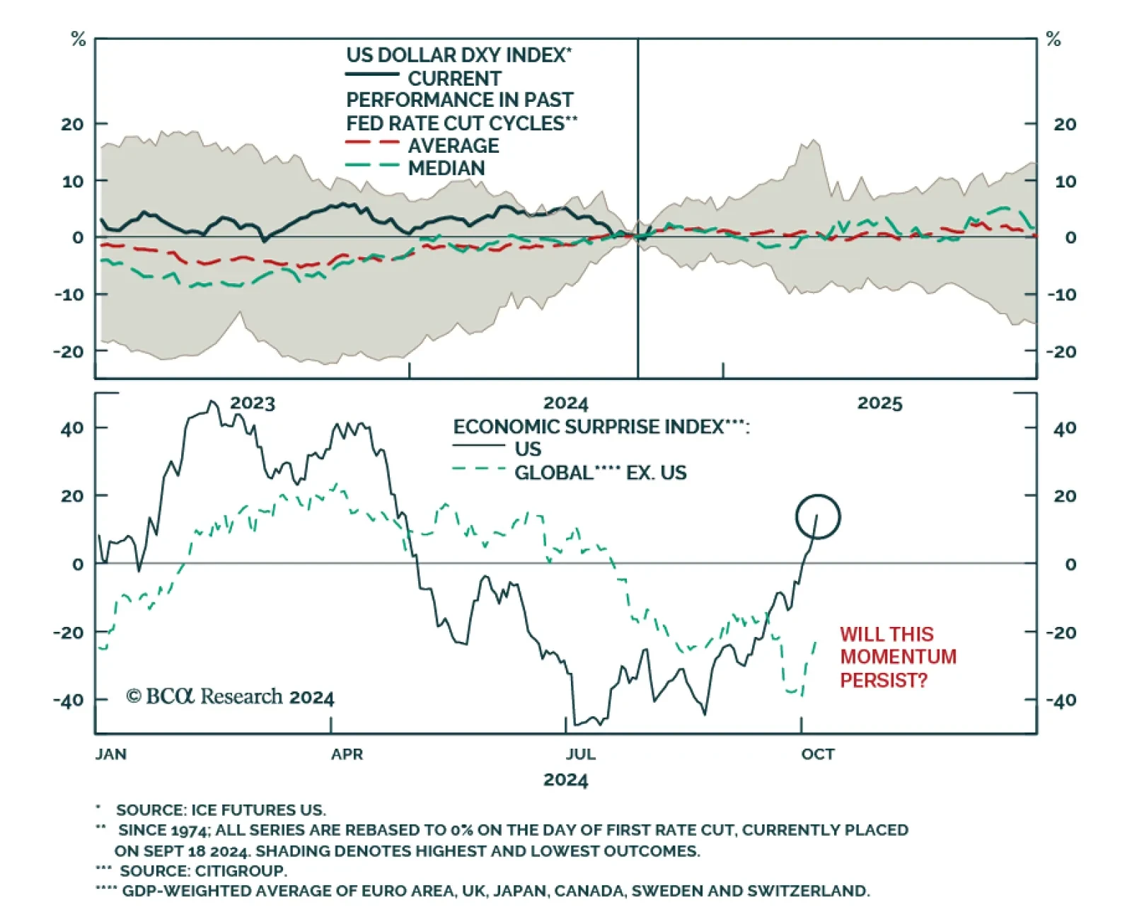 The dollar had erased all of its 2024 gains going into the fall, as markets prepared for Fed rate cuts. After a nearly 6% drawdown over the spring and summer, last week’s DXY rally brought the dollar back into the black YTD…