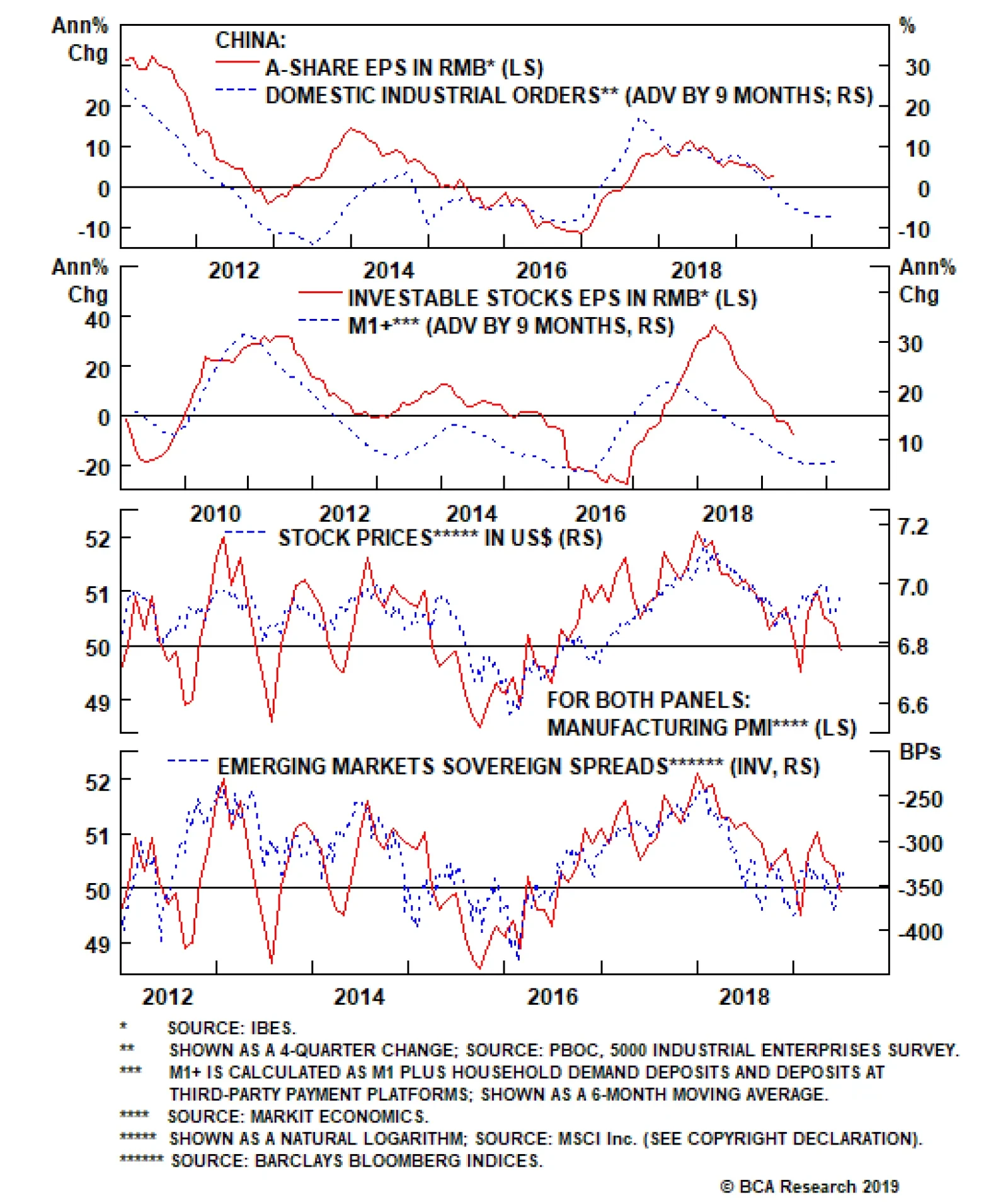 EM share prices are at a critical juncture (Chart I-1). Their ability to hold their recent lows and break above their April highs will signify that a sustainable cyclical rally is in the making. Failure to punch through April’s highs will pose a major breakdown risk. In brief, EM is facing a make-it-or-break-it moment. Fundamentally, the outlook for EM risk assets and currencies largely hinges on economic growth in general and corporate profits in particular. In our June 20 report, we illustrated that the primary drivers of EM risk assets and currencies have historically been their business cycles and profit growth – not U.S. interest rates. Falling interest rates are positive for share prices when profits are expanding, even if at a slower rate. However, when corporate profits are contracting, lower interest rates typically do not preclude equity prices from dropping. Hence, lower global interest rates in of themselves are not a sufficient condition to foster a sustainable cyclical EM rally. As to EM corporate profits, the rate of their contraction will continue deepening. Since early this year, we have been arguing that expectations of recovery in the Chinese economy and global trade are unwarranted. That is why BCA’s Emerging Markets Strategy team contends that EM risk assets and currencies, as well as China-plays, face the risk of a breakdown. This differs from BCA’s house view, which is positive on global risk assets in general. Global And Chinese Business Cycles: No Recovery So Far Chart I-2Chinese A-Share EPS Is Heading Into Contraction