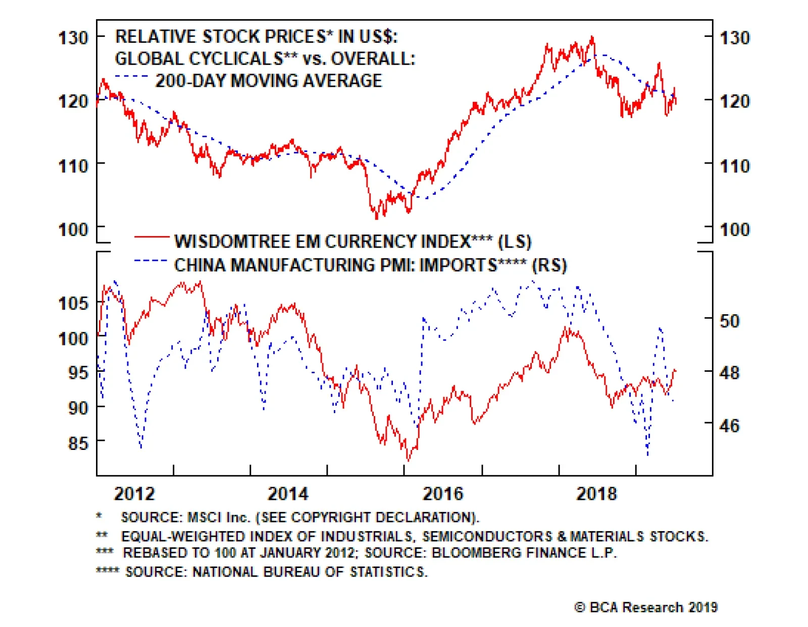 It seems that the global equity and credit markets expect an imminent recovery in the global business cycle in general and in China in particular. As we elaborated in the previous reports, the current global manufacturing recession stems primarily from China. Our leading indicators of the mainland business cycle suggest that more growth disappointments are likely before China’s growth and other economies’ shipments to the mainland hits a bottom (Chart I-7). For example, Korea’s exports to China in June were still dropping by 24% from a year ago. The primary reason for the lack of revival in growth is that China’s stimulus efforts have so far not been large enough, and the marginal propensity to spend among households and companies is diminishing, offsetting the positive effect of the stimulus, as we have discussed in previous reports. Will the recent G20 trade truce between the U.S. and China boost business confidence worldwide and in China? In our view, it is unlikely to produce a quick and meaningful recovery in business confidence among multinational companies and Chinese businesses. Corporate managers have probably come to realize that the U.S.-China row is not about import tariffs but rather geopolitical confrontation between the existing hegemon and a rising superpower. Hence, there is no easy solution that will satisfy both parties. An acceptable resolution for China will be unacceptable for the U.S., and vice versa. Hence, it will be hard to find a formula that gratifies both sides politically and economically. Overall, we reckon there are low odds in the next six months of an agreement between the U.S. and China that removes tariffs, addresses structural issues and satiates both nations. Korea’s exports are shrinking, as are EM EPS. Finally, even though the S&P 500 is hovering around its previous highs, under-the-surface dynamics have been less upbeat. Specifically, the equal-weighted share price index of U.S. high-beta stocks in cyclical sectors such as industrials, technology and consumer discretionary versus the S&P 500 has been tame and has not yet broken above its 200-day moving average (Chart I-8, top panel). The same holds true for the relative performance of an equal-weighted stock index of global cyclical sectors such as industrials, materials and semiconductors against the overall global equity benchmark (Chart I-8, bottom panel). Conversely, despite its recent setback, the U.S. dollar has technically not yet broken down (Chart I-9, top panel). In fact, our composite momentum indicator for the broad trade-weighted dollar has troughed at zero – a sign that downside is limited and another up-leg will likely emerge soon (Chart I-9, bottom panel). Chart I-8Cyclical Stocks Have Been Underperforming