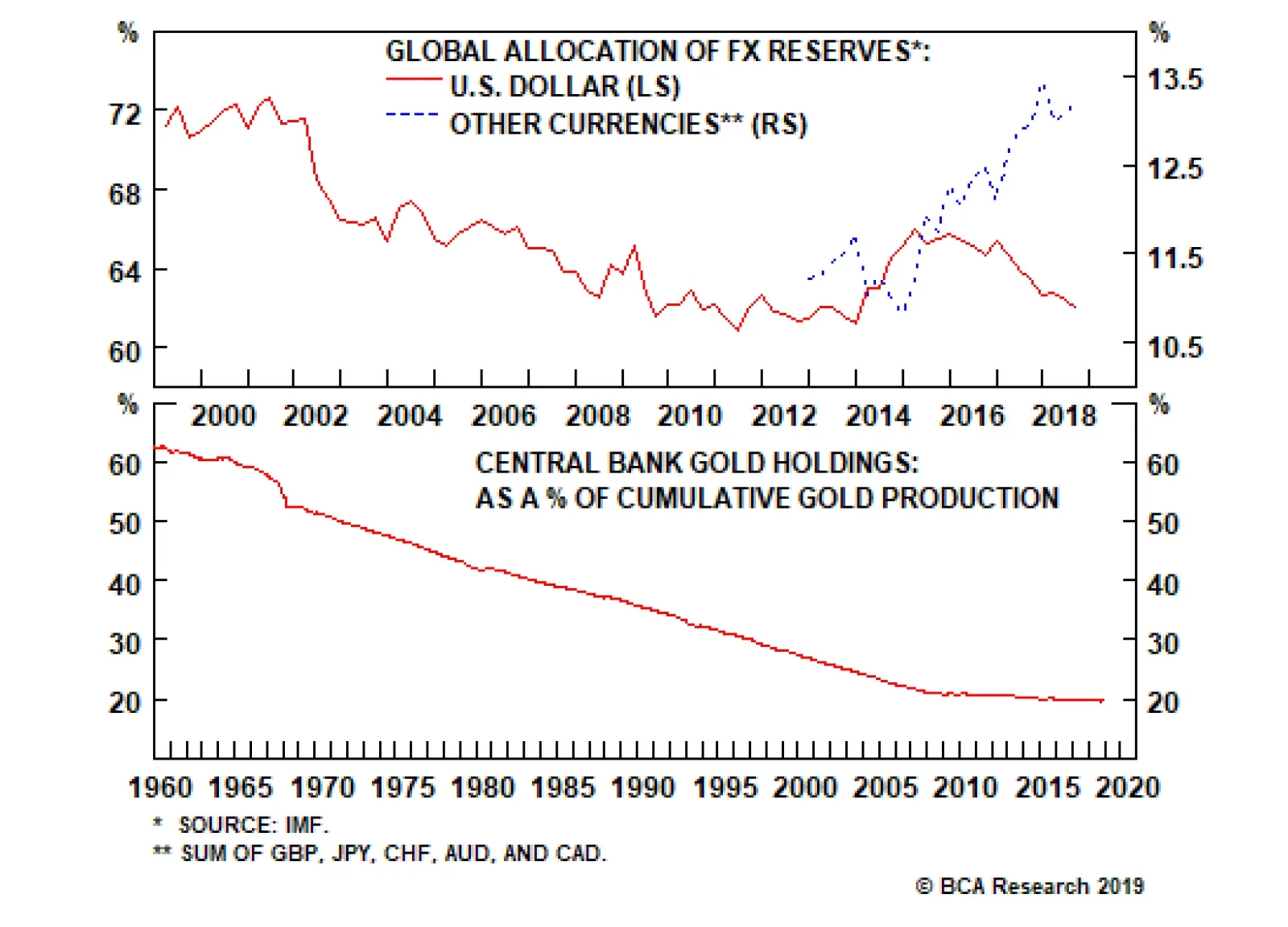Data from the International Monetary Fund (IMF) shows that the global allocation of foreign exchange reserves towards the U.S. dollar peaked at about 72% in the early 2000s and has been in a downtrend since. Meanwhile, allocation to other currencies, notably…