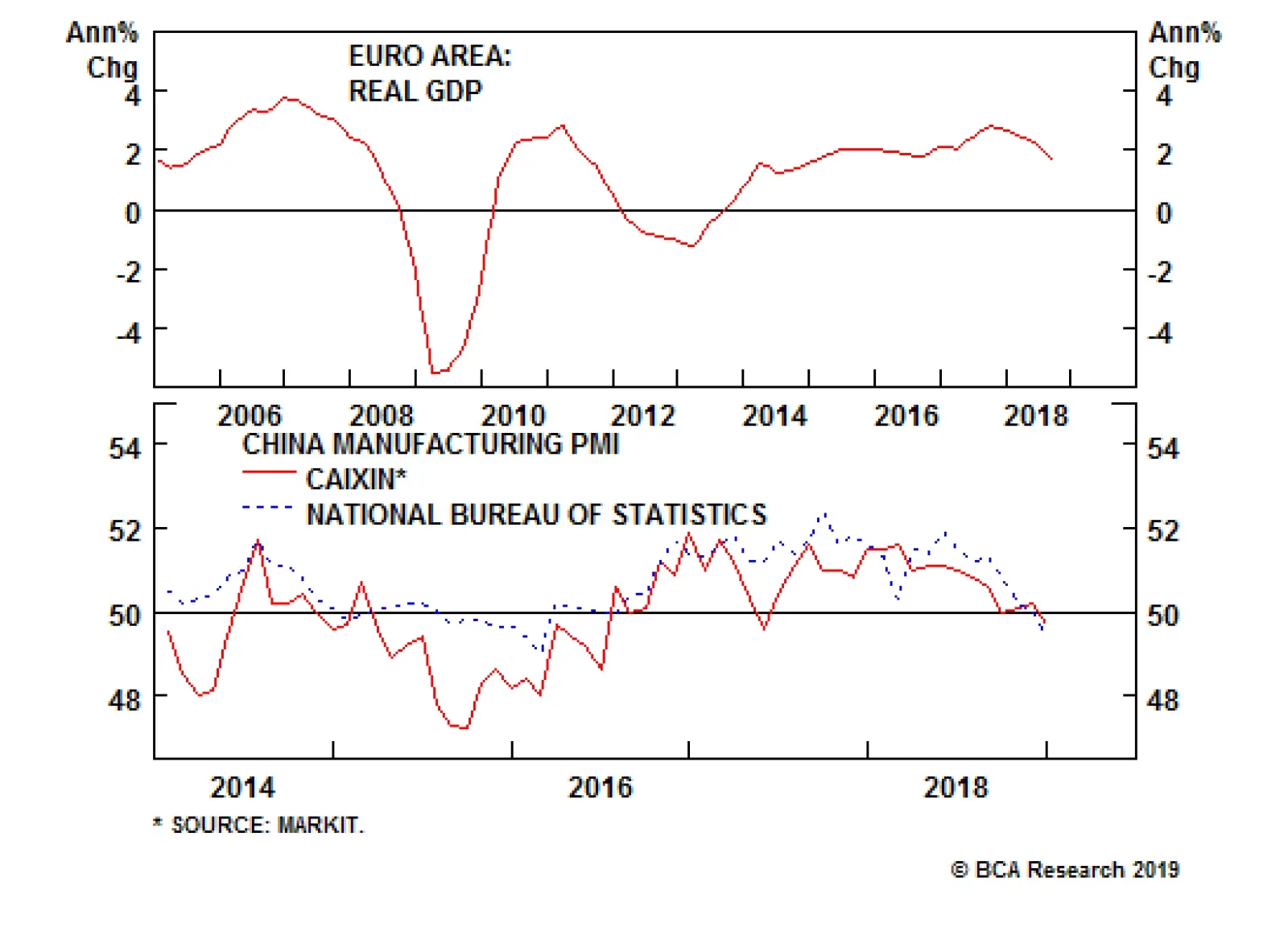 Europe and Japan, in particular, are feeling the pinch. German GDP only grew 1.5% in 2018, implying that Q4 GDP growth was in the vicinity of just 0.2% QoQ. Meanwhile, European industrial production contracted by 3.3% year-over-year in December. The German Ifo and ZEW surveys do not point to any significant improvements in this trend. A few idiosyncratic factors explain some of this poor performance, including new emissions testing standards that have weighted on the German auto industry, a tightening in financial conditions in Italy, and the ‘gilets jaunes’ protests in France. Nonetheless, the euro area slowdown cannot be fully explained by one-off factors. The economy is highly sensitive to global trade fluctuations given that 18% of the euro area’s gross value added is generated in the manufacturing sector. Hence, China’s poor economic health has been painful for Europe, and the trend in Chinese credit does not bode well for the near term (Chart I-10). The European Central Bank (ECB) is likely to stay on the defensive as a result, especially as euro area core inflation, which has been stuck near 1% for three years, is unlikely to pick up if growth remains on the back foot. The ECB stuck with the view that the economic soft patch is temporary after the January policy meeting, but policymakers will consider providing more stimulus in March if the economy does not pick up (using forward guidance or a new TLTRO). This will weigh on the euro. Chart I-10China's Woes Are Infecting Europe