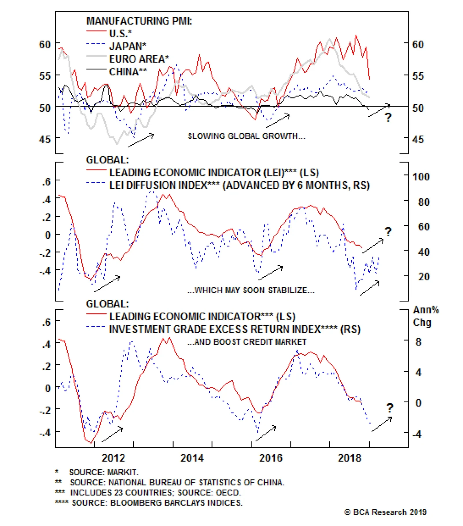 This set off yet another clash between policy and the markets – one of BCA’s key investment themes for 2018 that still applies in 2019 – resulting in a sharp selloff in global risk assets, including corporate debt. The result was a tightening of U.S. financial conditions, first through a stronger U.S. dollar (supported by rate hike expectations) and later through lower equity prices and wider corporate spreads. This echoed the 2014/15 period when the Fed was trying to lift rates off the zero bound after ending its quantitative easing program. The Fed was only able to deliver a single rate hike in December 2015 before pausing because of severely slumping global growth (most notably in China) and a sharp tightening in financial conditions, both of which knocked the wind out of the U.S. economy. Turning to 2019, the downturn in cyclical growth indicators like manufacturing purchasing managers indices (PMI) and the global leading economic indicator (LEI) has reached levels last seen after that 2014/15 episode (Chart 3). Importantly, our global LEI diffusion index, which measures the number of countries with rising LEIs compared to falling LEIs and is itself a reliable leading indicator of the global LEI, is bottoming out at the same level that preceded the 2016 LEI revival (middle panel). This suggests that a stabilization of the global LEI could unfold in the next few months, which would also signal a potential rebound in corporate credit returns (bottom panel). Chart 3Credit Returns Already Reflect Slowing Growth