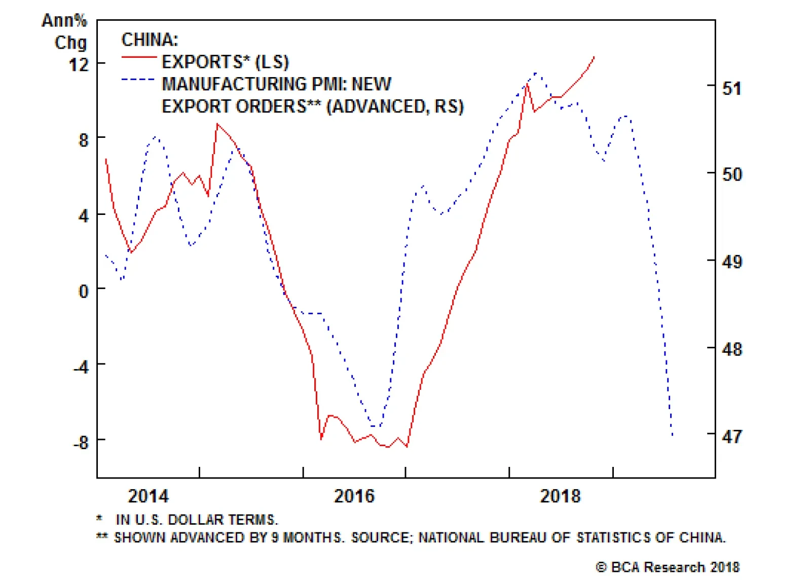 Chinese exports are holding up well so far, but this might only represent front-running ahead of the implementation of higher tariffs. Judging from the steep drop in the export component of both the official and private-sector Chinese manufacturing PMI, exports are likely to come under increasing pressure over the next few quarters as the headwinds from higher tariffs fully manifest themselves (Chart 15). Chart 15Chinese Exports About To Suffer
