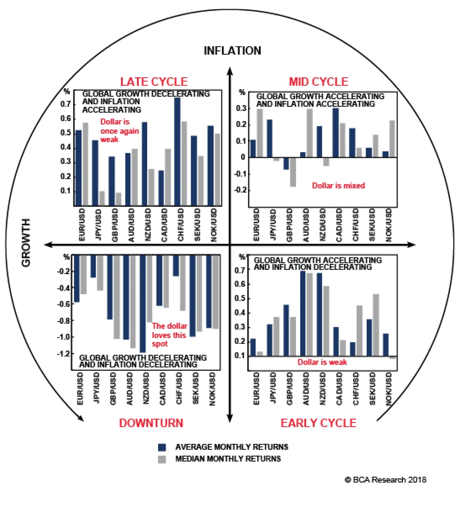 This relationship is obviously paradoxical. It exists because the dollar is not a normal currency: it is the premier reserve currency of the world. Resting at the center of the global financial system, the dollar is more sensitive to global growth and inflation conditions than to U.S. growth and policy alone. As Chart I-3 shows, the dollar's behavior is a function of where we stand in the global economic and inflation cycle. We looked at the performance of G-10 currencies versus the dollar since 1986, decomposing the period in four samples based on trends in global activity and global headline inflation. We observed the following patterns: When global growth is accelerating but inflation is decelerating, the dollar tends to weaken, especially against the very pro-cyclical AUD, NZD and SEK (Bottom right quadrant). This is often an environment observed in the early days of a business cycle recovery. When global growth and global inflation are both accelerating, the dollar also tends to weaken, but the pattern is much less clear than in the previous stage (Top right quadrant). This is generally a mid-cycle environment. When global growth is decelerating but global inflation is accelerating, the dollar weakens much more clearly than in the mid-cycle stage (Top left quadrant). In this stage, global growth has begun to decelerate but is still elevated. Risk assets are doing well, but some clouds are gathering on the horizon. European currencies perform best. The most distinct change in the dollar's behavior happens when both global growth and global inflation are decelerating (Bottom left quadrant). In this context, the dollar is strong across the board. This is an end-of-cycle environment where global growth is poor and inflation sags. Investors become very risk averse and they favor the dollar. Commodity currencies and Scandinavian currencies are the worst performers, while the yen is the best. We were surprised that the yen did not manage to appreciate during the periods described by the bottom-left quadrant. However, this is due to the long sample used (since 1986). Prior to the mid-1990s, the yen was a decidedly pro-cyclical currency. This taints the study's overall results. If we only use a shortened time span, the yen in fact appreciates in the last stage of the global business cycle. The yen is the only currency to experience such a sharp regime shift in its relationship to the global business cycle. Chart I-3The Dollar And The Global Business Cycle