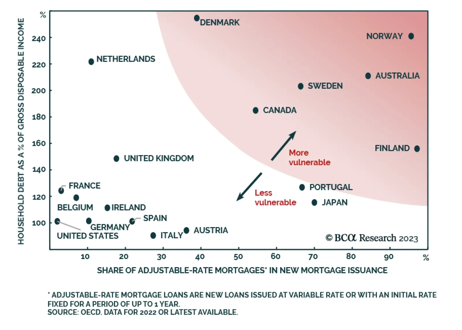 While the housing downturn will be fairly mild in the US, it will be more severe abroad. Continue to favor bonds of countries whose housing fundamentals will limit rate hikes.