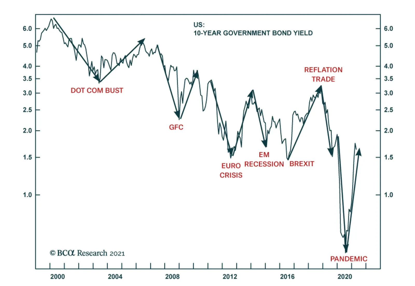 Global growth will rebound later this year, fueled by an end of lockdowns and generous fiscal stimulus. Despite that, central banks will not move towards tightening until 2023 at the earliest. This remains a very positive environment for risk assets like equities, though the upside is inevitably limited given stretched valuations. We continue to recommend a risk-on position, with overweights in equities and higher-risk corporate bonds. It is unlikely that long-term rates will rise much further over the coming months. But there is a risk that they could, and so we become more wary on interest-sensitive assets. Accordingly, we cut our overweight on the IT sector to neutral, and go overweight Financials. We continue to prefer cyclical sectors, and stay overweight Industrials and Energy. Chinese growth is slowing and so we cut our recommendation on Chinese equities to underweight. Some Emerging Markets will suffer from tighter US financial conditions, so we would be selective in our positions in both EM equity and debt. We stay firmly underweight government bonds, and recommend an underweight on duration, and favor linkers. Within alternatives, we raise Private Equity to overweight. The return to normality will give PE funds a wider range of opportunities, and allow them to pick up distressed assets at attractive valuations. Overview What Higher Rates Mean For Asset Allocation The past few months have seen a sharp rise in long-term interest rates everywhere (Chart 1). These have reflected better growth prospects, but also a greater appreciation of the risk of inflation over the next few years (Chart 2). Our main message in this Quarterly Portfolio Outlook is that we do not expect long-term rates to rise much further over the coming months, but that there is a risk that they could. This would be unlikely to undermine the positive case for risk assets overall, but it would affect asset allocation towards interest-rate sensitive assets such as growth stocks and Emerging Markets, and could have an impact on the US dollar. Chart 1Rates Are Rising Everywhere